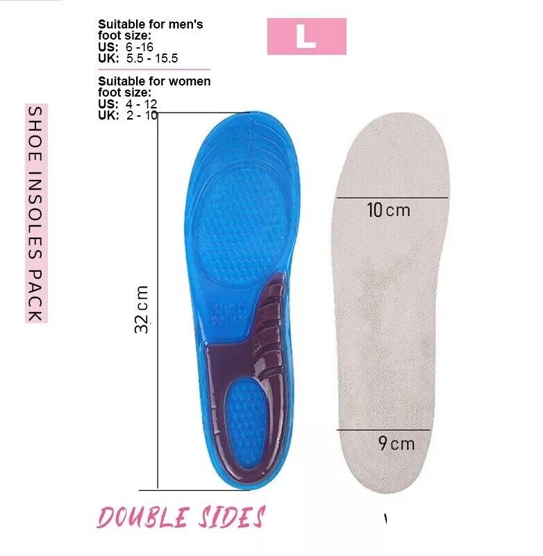 Package includes: 1 Pair Selected Size Gel Shoe Insoles - L - 10cm