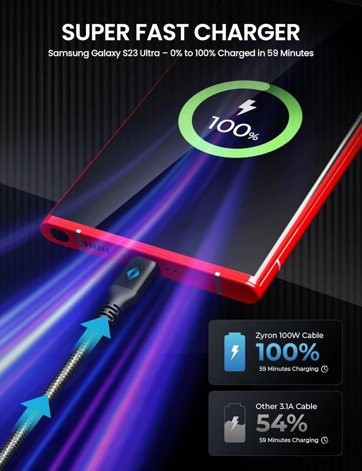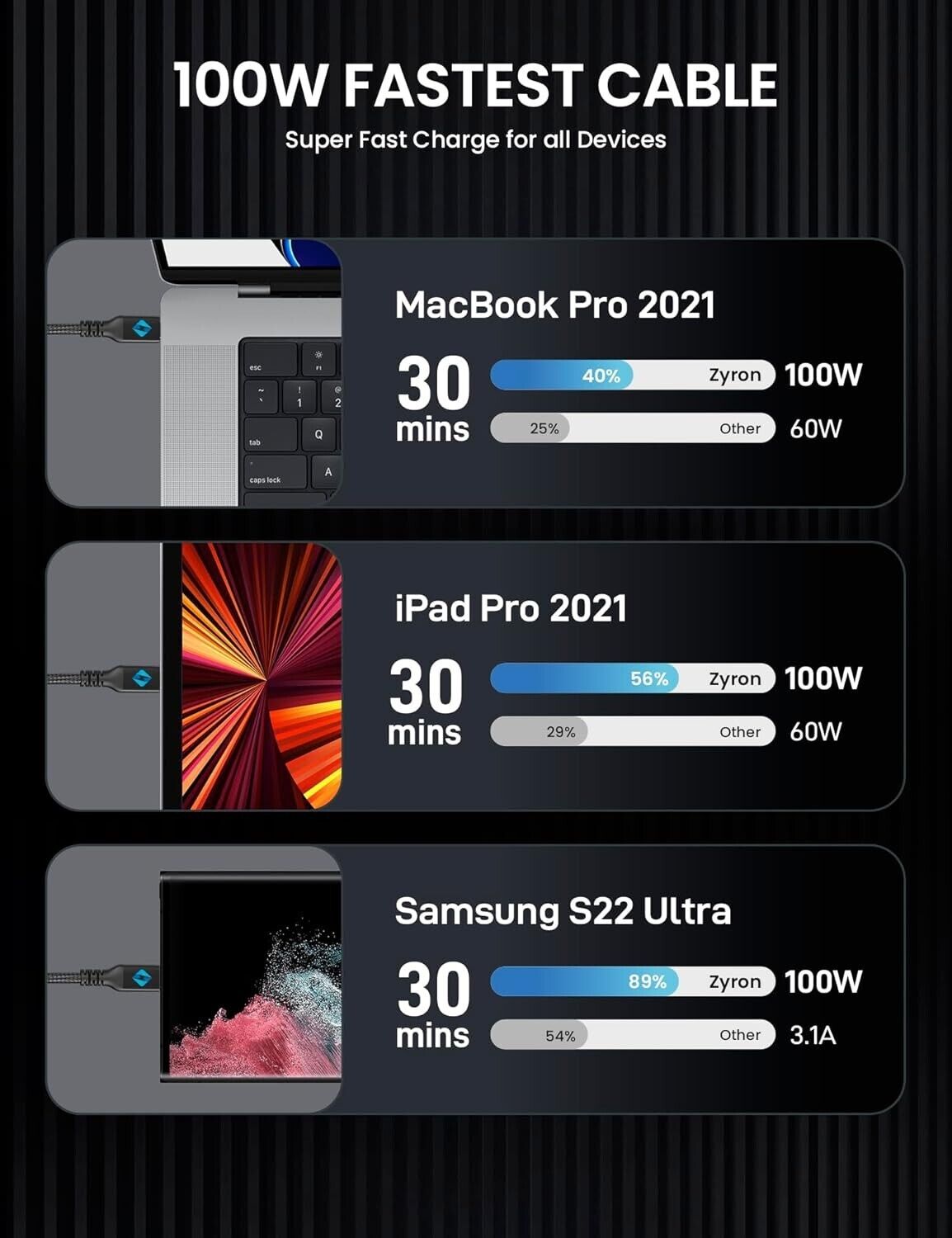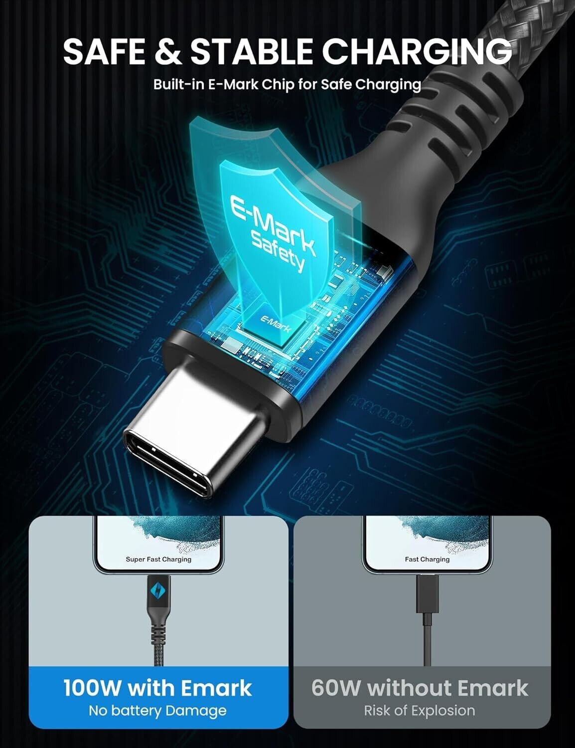 - 100W USB-C Cable blends innovation with safety, integrating an E-Mark chip for exceptional power delivery and steadfast protection against overcurrent and overvoltage; it ensures devices like MacBook Pro, iPad, and smartphones are securely charged, fuels up Samsung S23 Ultra to whopping 100% in 59 Mins and Macbook Pro to 40% in 30 mins.