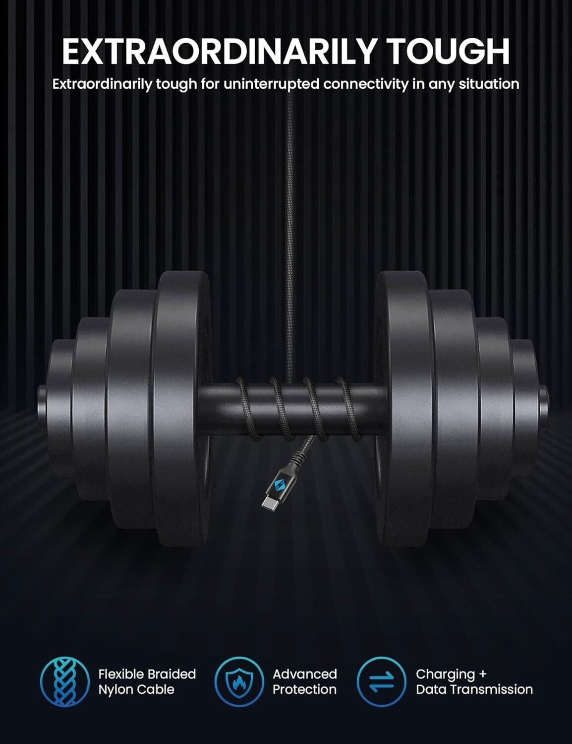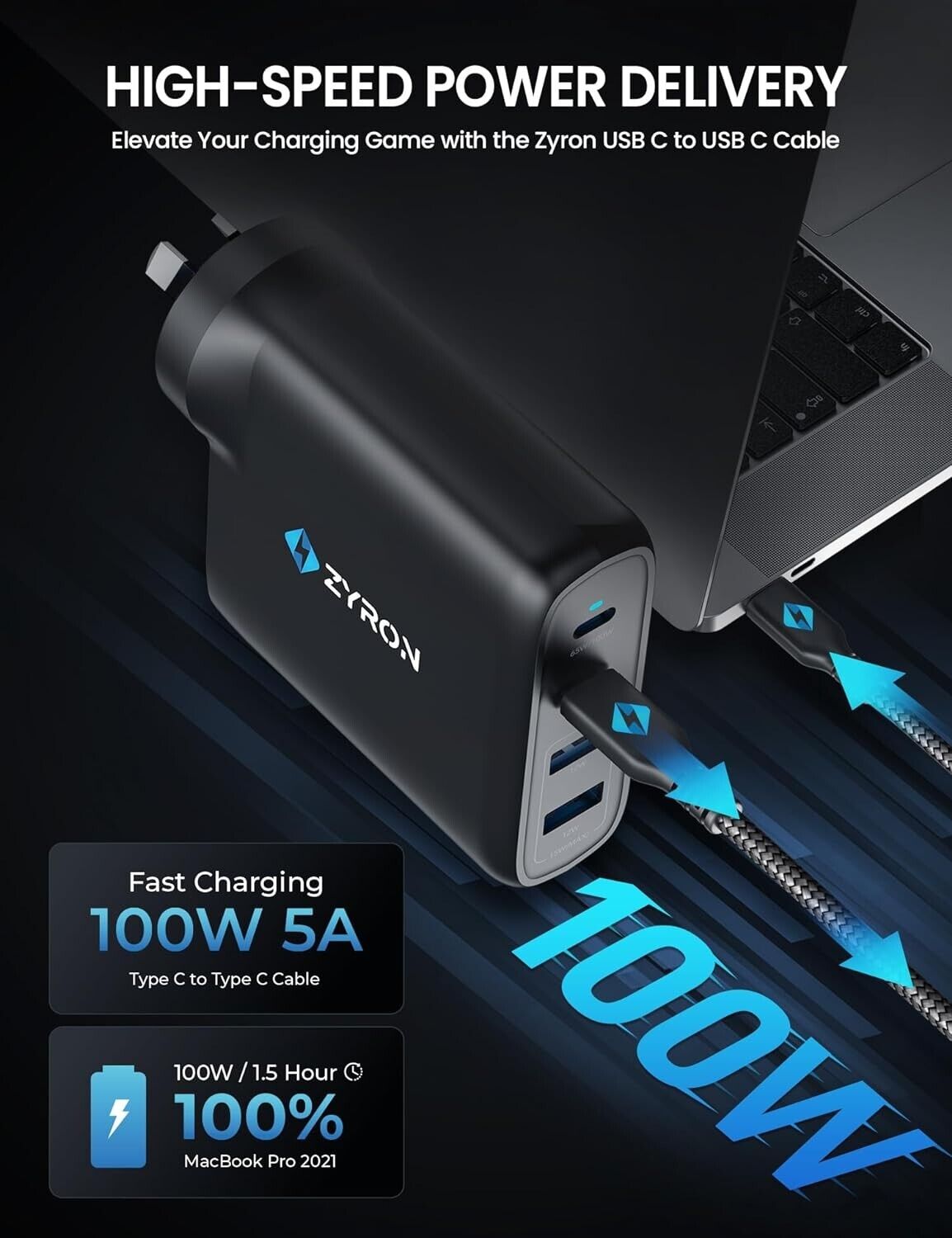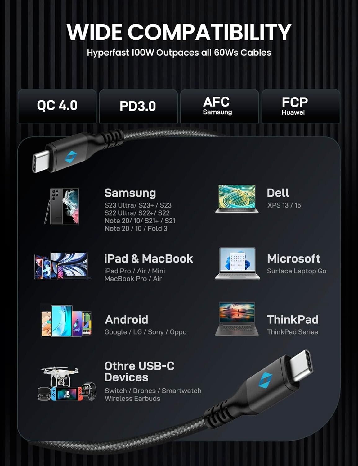 - 100W USB-C Cable blends innovation with safety, integrating an E-Mark chip for exceptional power delivery and steadfast protection against overcurrent and overvoltage; it ensures devices like MacBook Pro, iPad, and smartphones are securely charged, fuels up Samsung S23 Ultra to whopping 100% in 59 Mins and Macbook Pro to 40% in 30 mins.