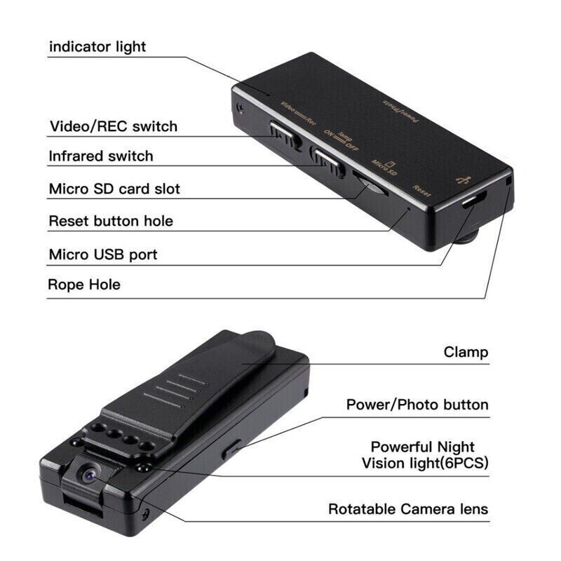 Perfect wearable MINI design with 1080P and 130 degree wide Angle lens, 6 infrared lights enhance night vision, clear display in low light conditions (LED lights don't work when recording).