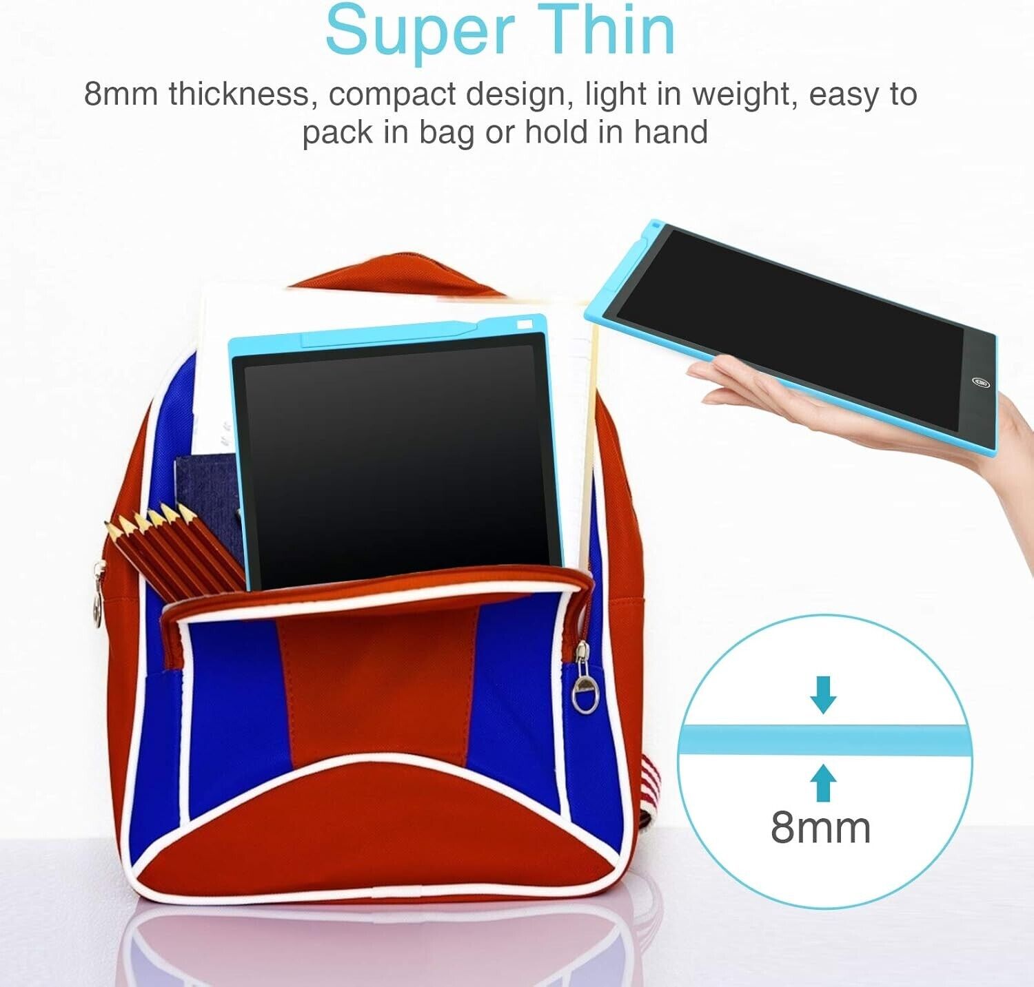 Kids can spend happy time anytime and anywhere, enjoying the fun of drawing, counting, doodling, and spelling phrases. The 12 Inch LCD Writing Tablet is lightweight and ultra-thin, It is easy for you to carry and can be easily slid into your backpack and bags, not only play at home, but also in cars, outdoors, plane, and school