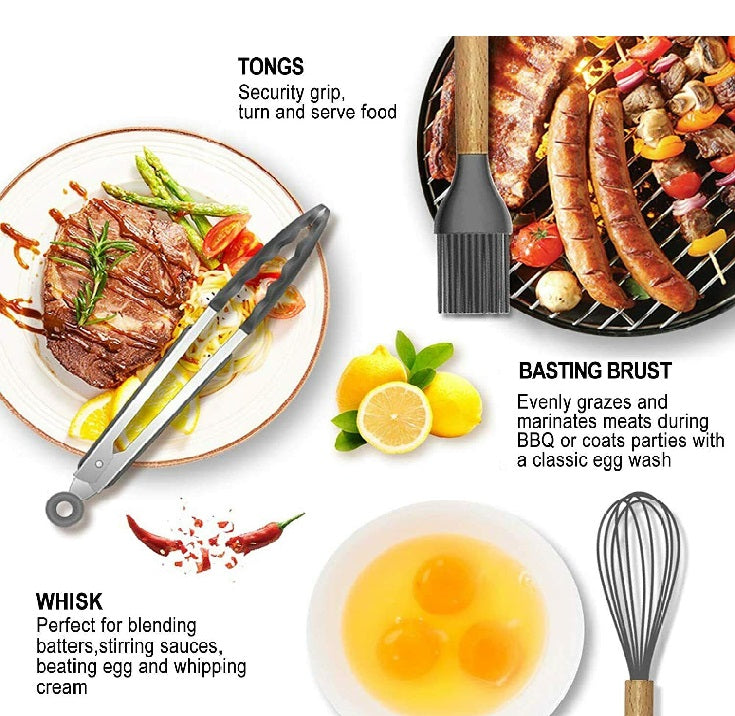 12PCS Set Silicone Utensils Wooden Cooking Kitchen Baking Cookware