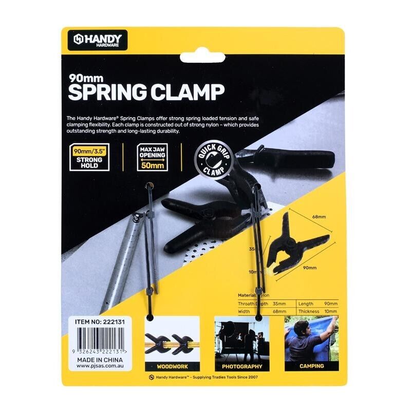 Handy Hardware® These heavy duty Spring Clamps are an impressive, highly versatile tool. With their strong clamping force, tensioned steel springs and flexible tips, these clamps are ready to assist you in securely holding your work in place.