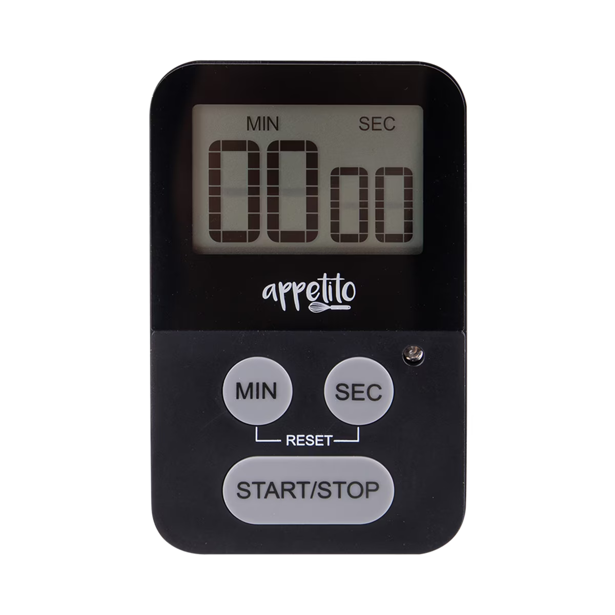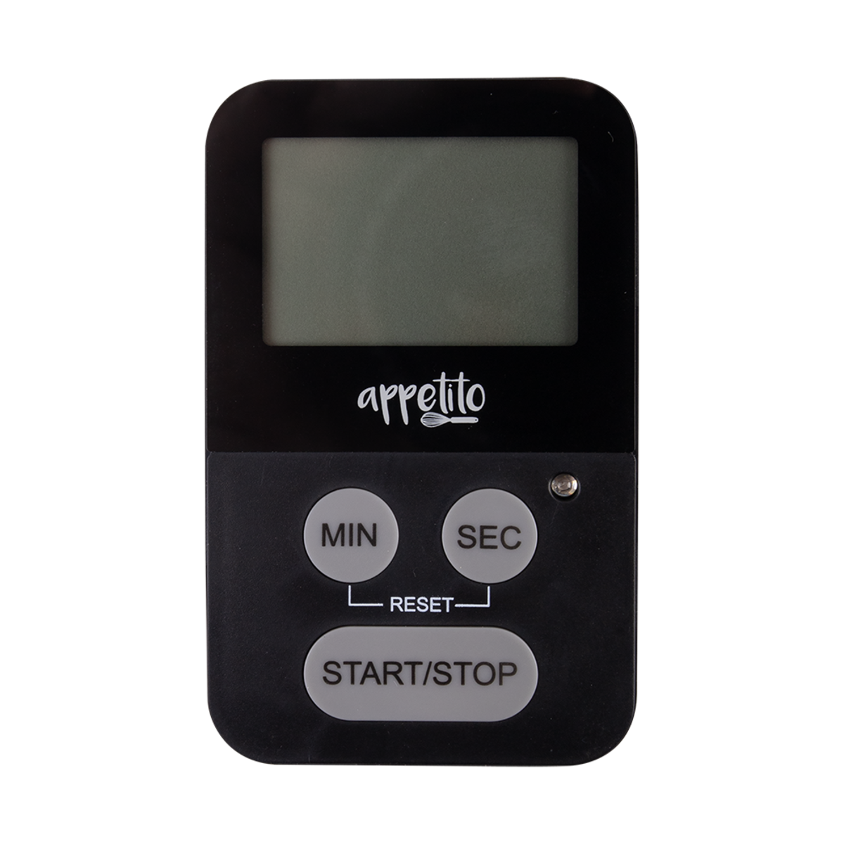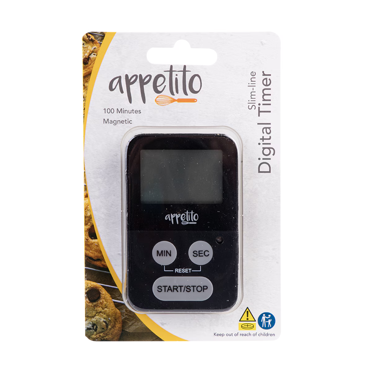 The Appetito Slim-line Digital Timer can count up or down, up to 100 minutes. Its magnetic backing allows for handy storage – simply attach it to a convenient magnetic surface such as the fridge or oven. This slim body timer also features an easy to read display, and alarm.