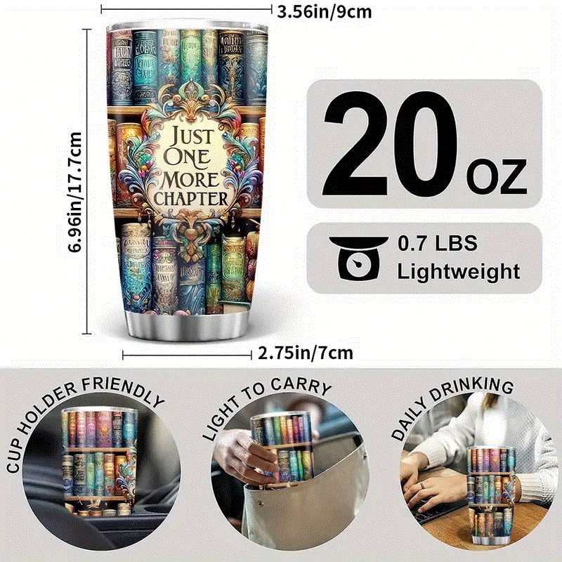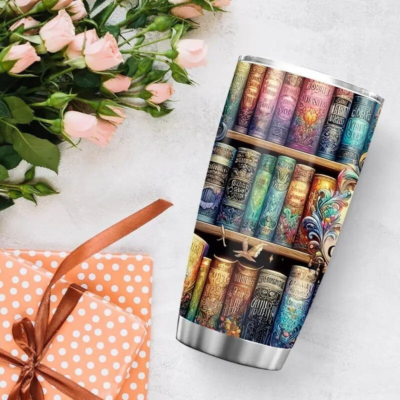 Embrace your love of reading on the go with this 20oz Stainless Steel Travel Tumbler featuring a stylish library-inspired design. Durable and double-walled, it's perfect for keeping your beverages hot or cold during long reading sessions or daily commutes.