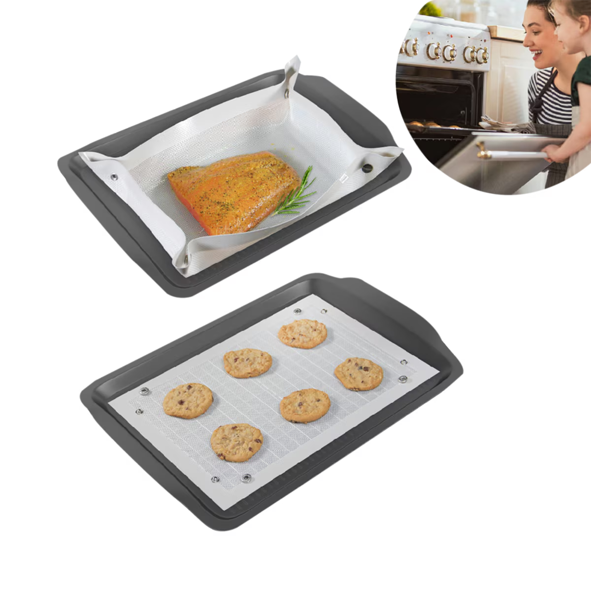 The baking mat has dual purpose; lay it flat on a baking tray for even, non-stick baking, or simply snap the corners together to create a leak-proof tray to catch oil and other liquids, locking in flavours, and ensuring no oven mess.