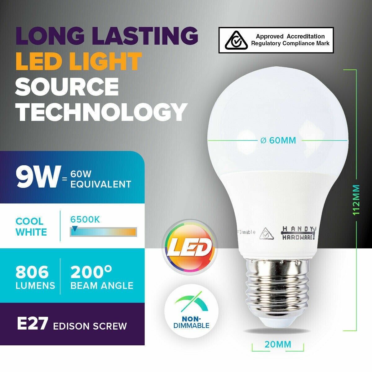 Handy Hardware® This 9W screw LED light bulbs emit cool white light.