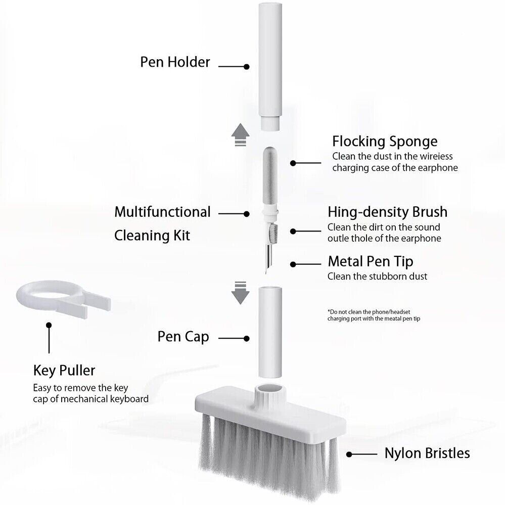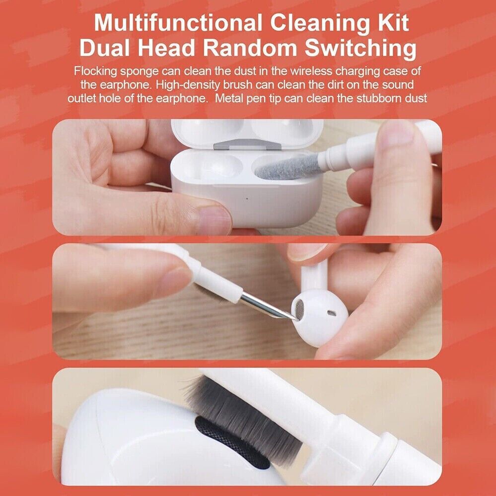 - Multifunctional cleaning set: Flocking sponge can clean the dust in the wireless charging box of the headset. The high-density brush can clean the dirt on the sound outlet of the headset. The metal nib can clean stubborn dust