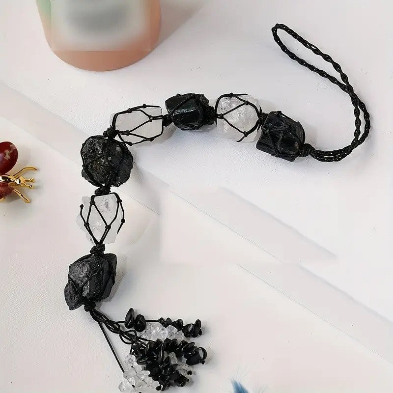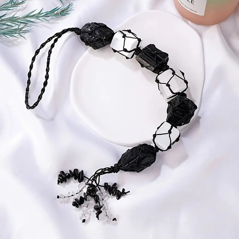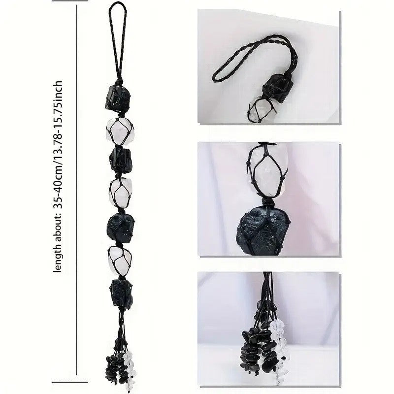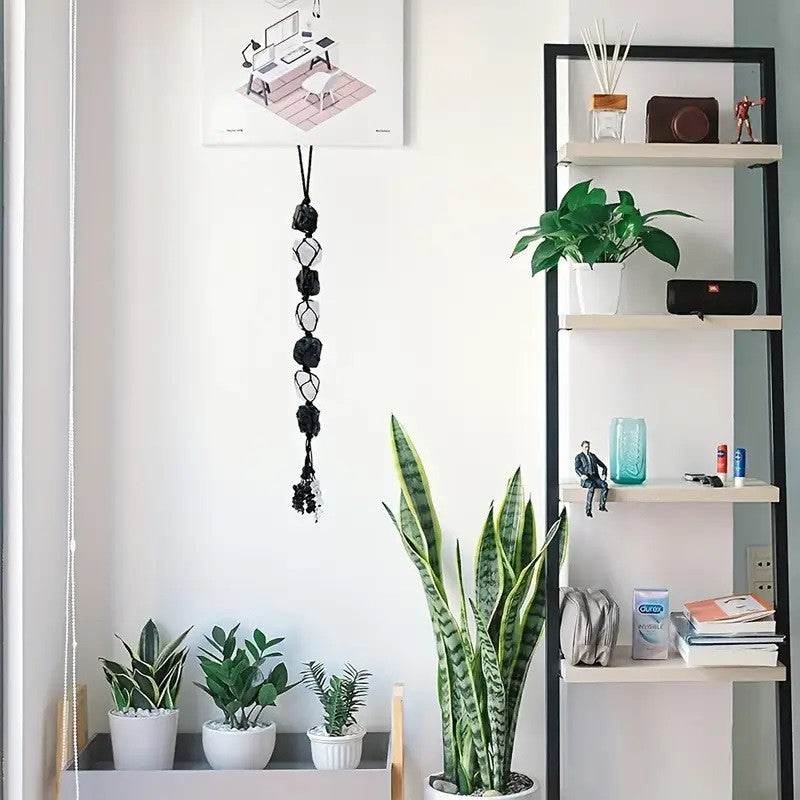 Add a touch of natural elegance to your space with this hand-woven crystal and raw stone wall hanging. Designed in a classic black and white style, it makes a beautiful decorative accent for your home, office, or meditation area.