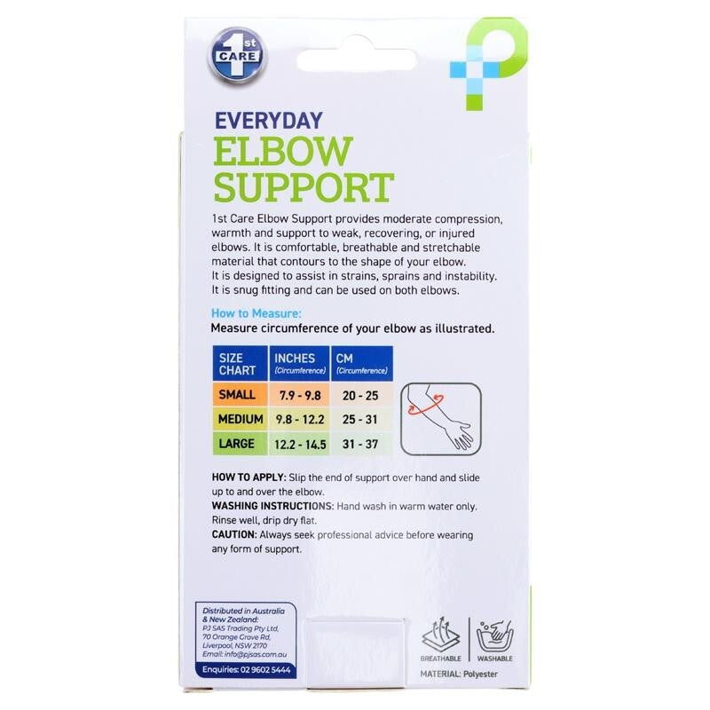1ST CARE Elbow Support provides moderate compression, warmth, and support to weak, recovering, or injured elbows.