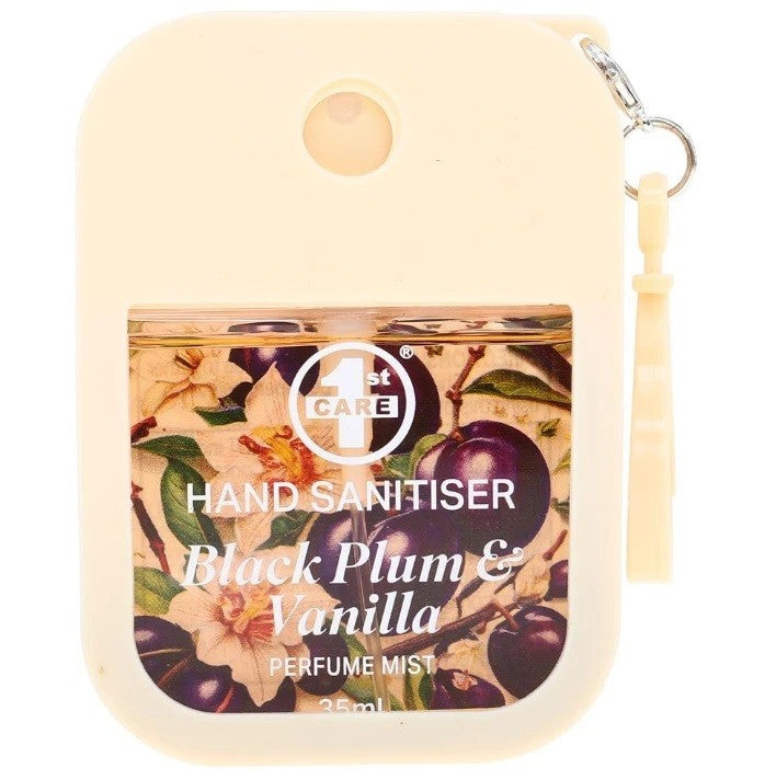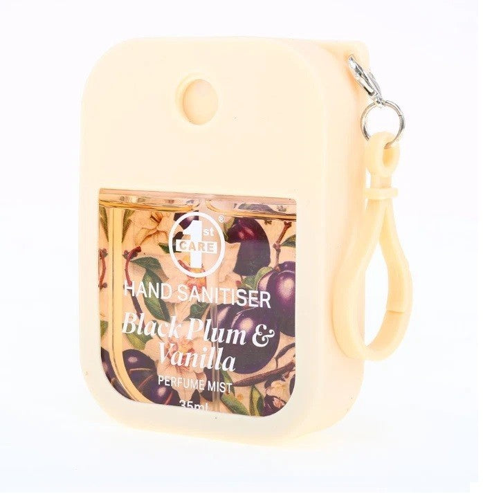 1x Hand Sanitizer Spray Perfume Mist 35ml Silicone CaseClip Black Plum & Vanilla