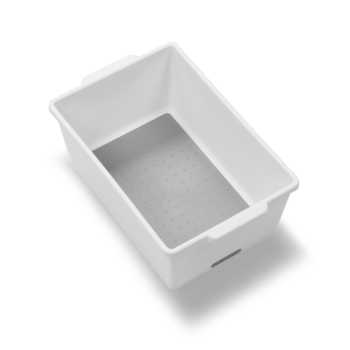 The bin features 2 handles for portability, rounded corners for easy cleaning, as well as soft-grip lining and non-slip rubber feet to keep items in place.