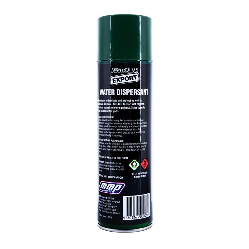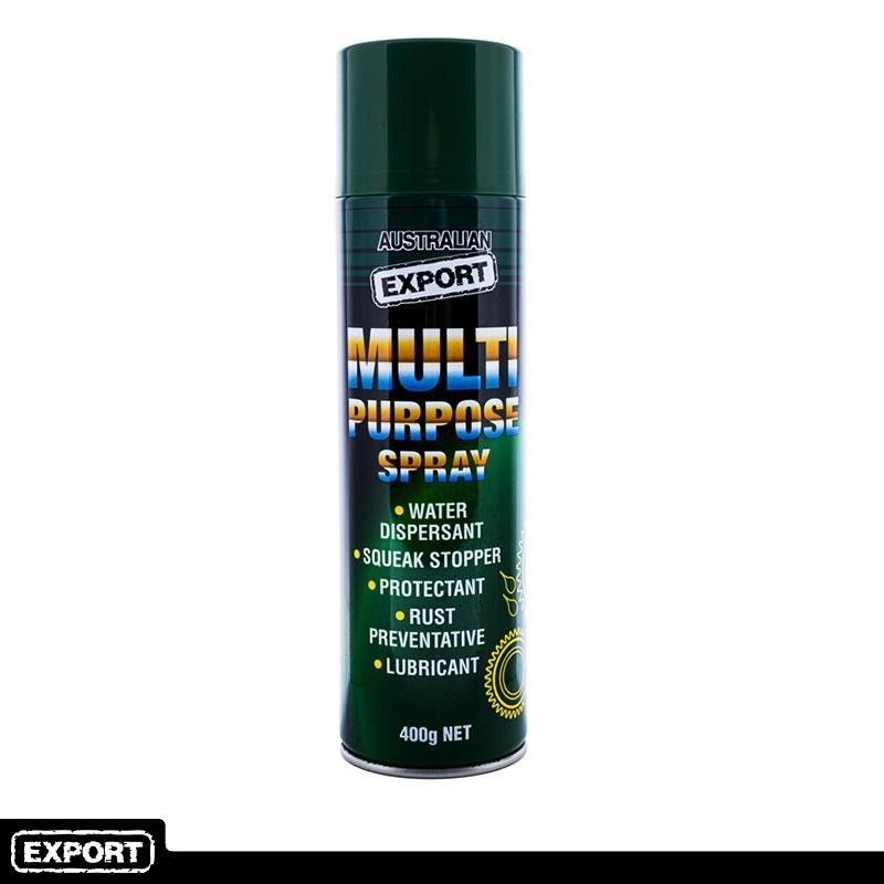 AUSTRALIAN EXPORT multi-purpose (Water Dispersant) Spray 400g net, that is formulated to lubricate and protect. Containing Propellant Hydrocarbon‚ and Aluminium Pressurised‚ this product is suitable for use on wet engine motors, rusty iron, squeaky hinges, motor parts and any home imperfections.‚ Proudly Australian Made and‚ an effective lubricant, squeak stopper and‚ rust preventative‚ this product can be applied to multiple surfaces.