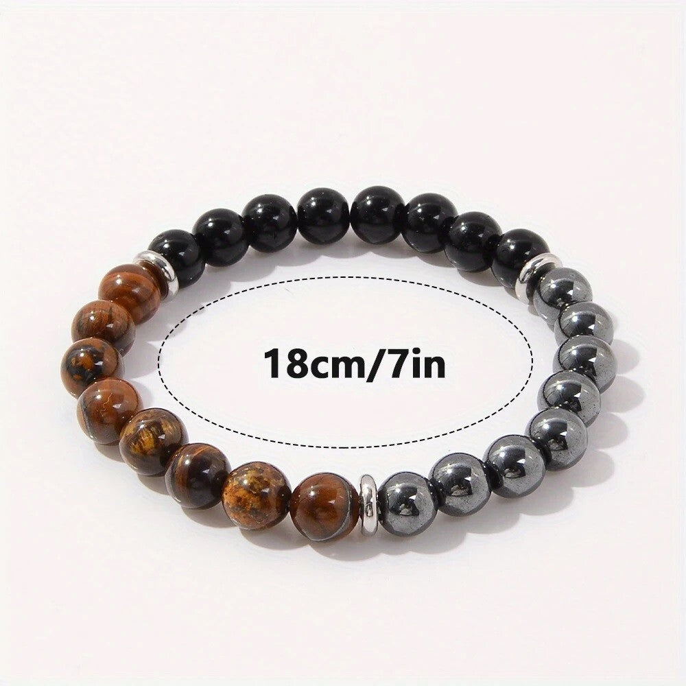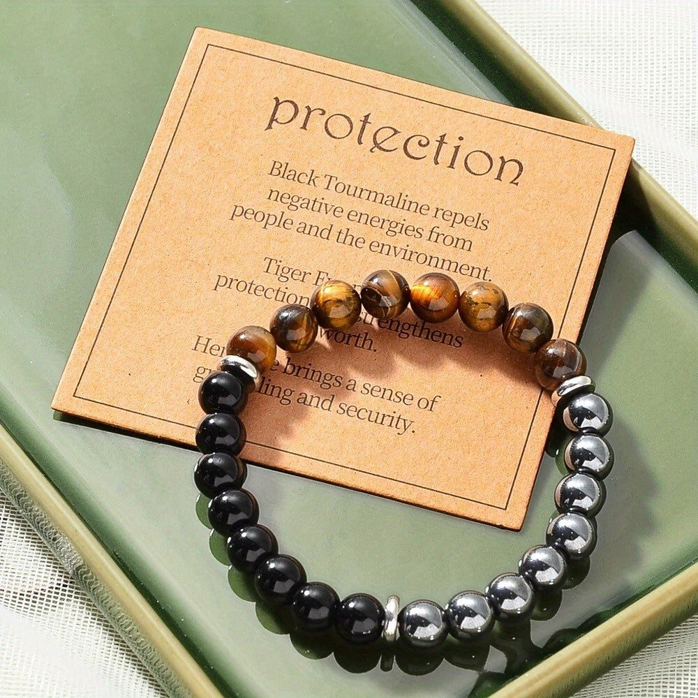The bracelet is made with 8mm round natural stones—Tiger Eye, Black Obsidian, and Hematite—each known for their grounding, shielding, and energy-balancing properties.