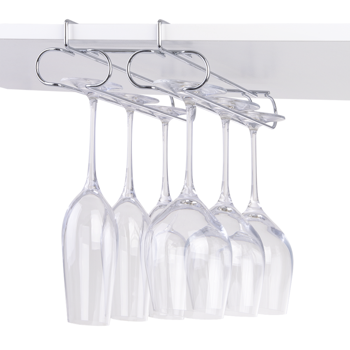 A safe and stylish way to organize and store your stemmed champagne or wine glassware, this practical chrome plated 28cm deep Bartender rail undershelf stemware rack can be easily suspended under most standard-size cupboard or pantry shelving. No tools or hardware required, ideal for renting or short-term convenience.