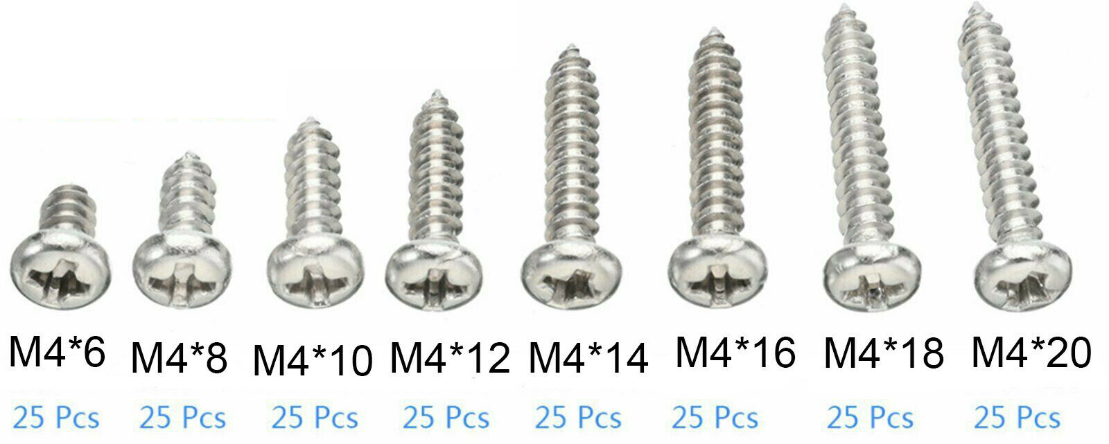 200pcs M4 304 Stainless Steel Self-Tapping Screws Assorted Kit Pan Head Set