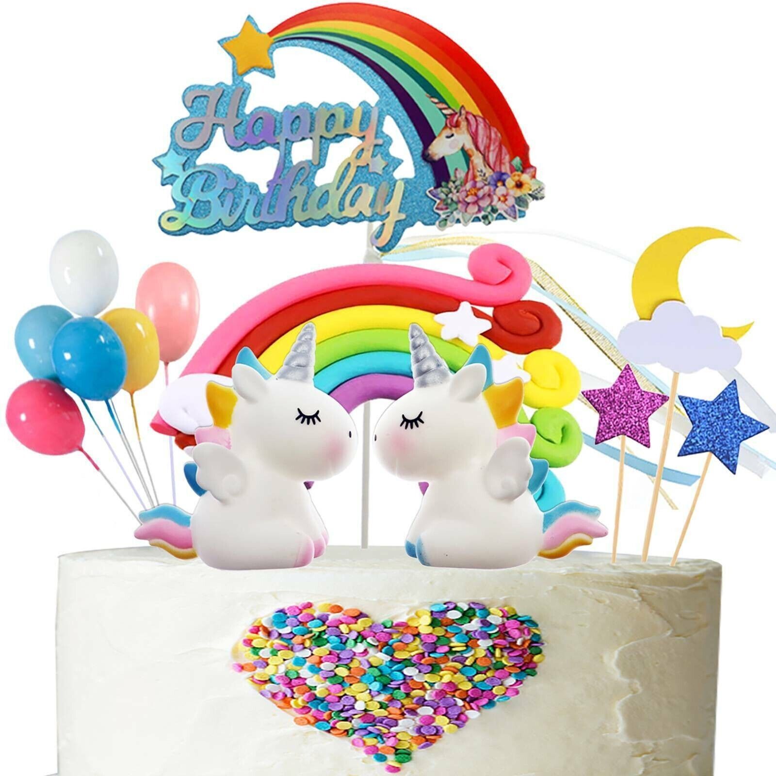 - Unicorn Happy Birthday Cake Decoration Including: 1x Rainbow,1x Happy Birthday Toppers,2x Unicorn,3x Star & Moon,6x little balls,8x White cloud. Fits best on 6inch-10inch cakes.