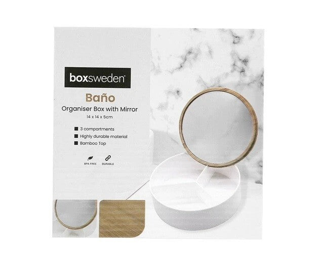 Organise your bathroom in style with our Boxsweden Bano 3 Section Round Organiser Box With MIrror. Our design is BPA free, durable and easy to clean. Plus, the bamboo lid is also a mirror that you can stand up from the inside of the box. Perfect addition to your bathroom alongside the rest of the Bano range!