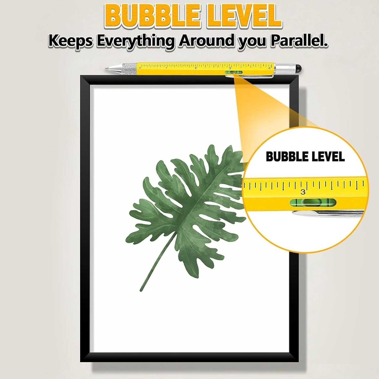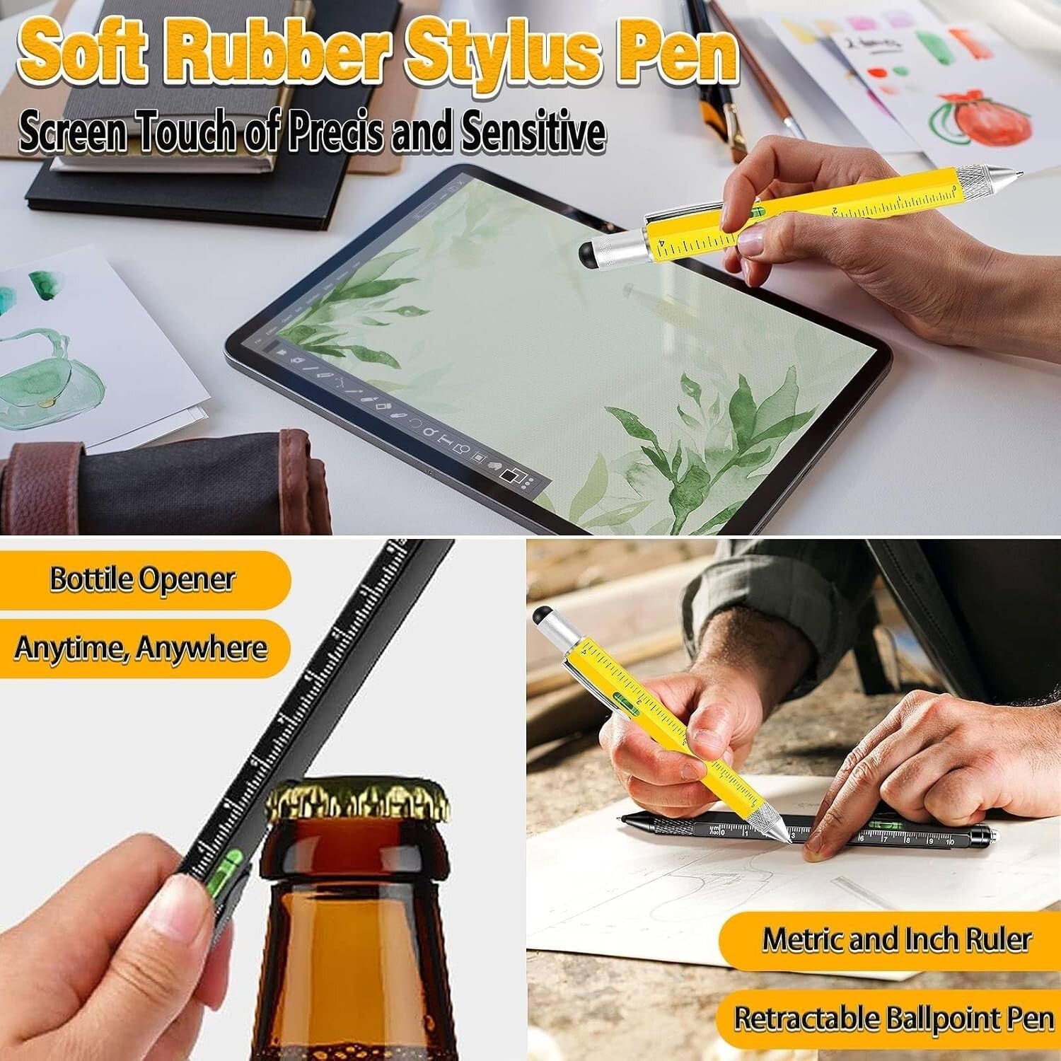 The multi tool pen has 9 handy functions - led light, stylus top, retractable ballpoint pen, bubble leveler, bottle opener, Centimeters / Inches rulers, Flat / Phillips screwdriver.