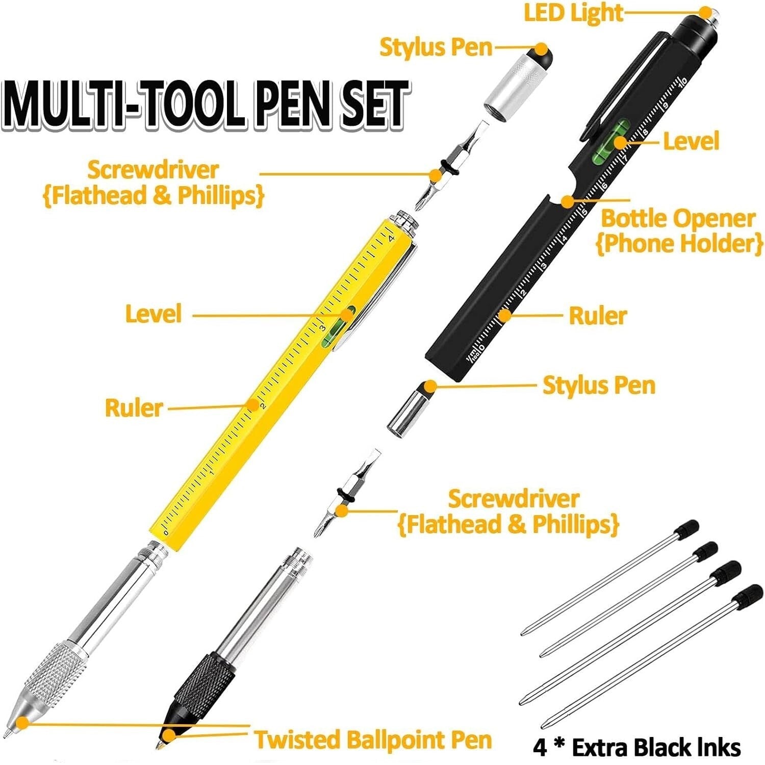 Package Includes: 2Pcs Multitool Pen Set 9-in-1 Black and Yellow