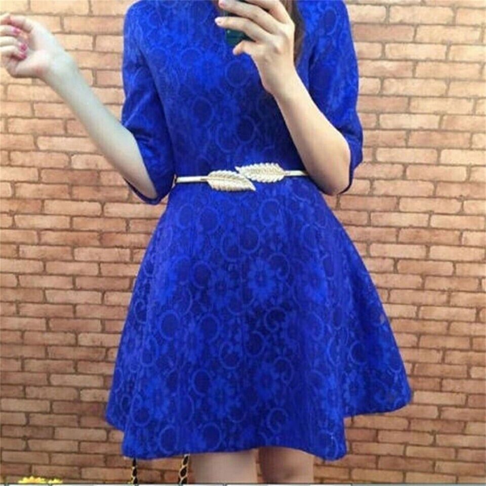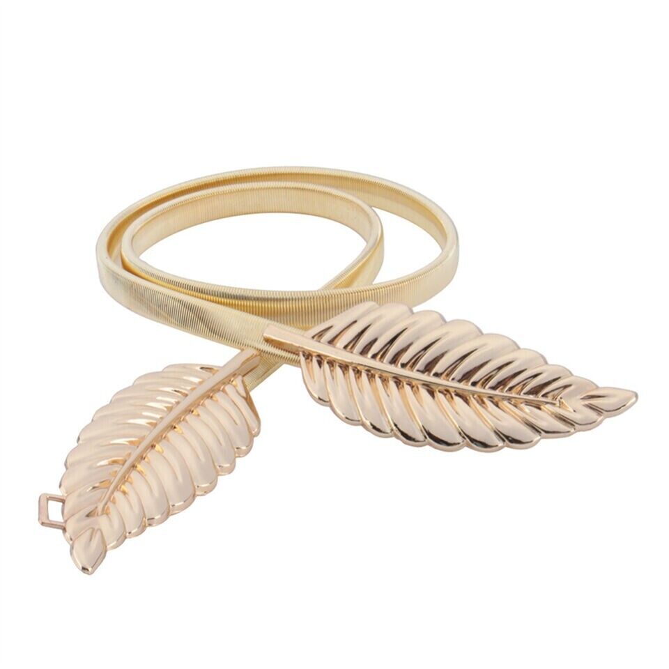 2pcs Women Gold Leaf Belt Elastic Metal Stretch Buckle Skinny Waist Dress Belt
