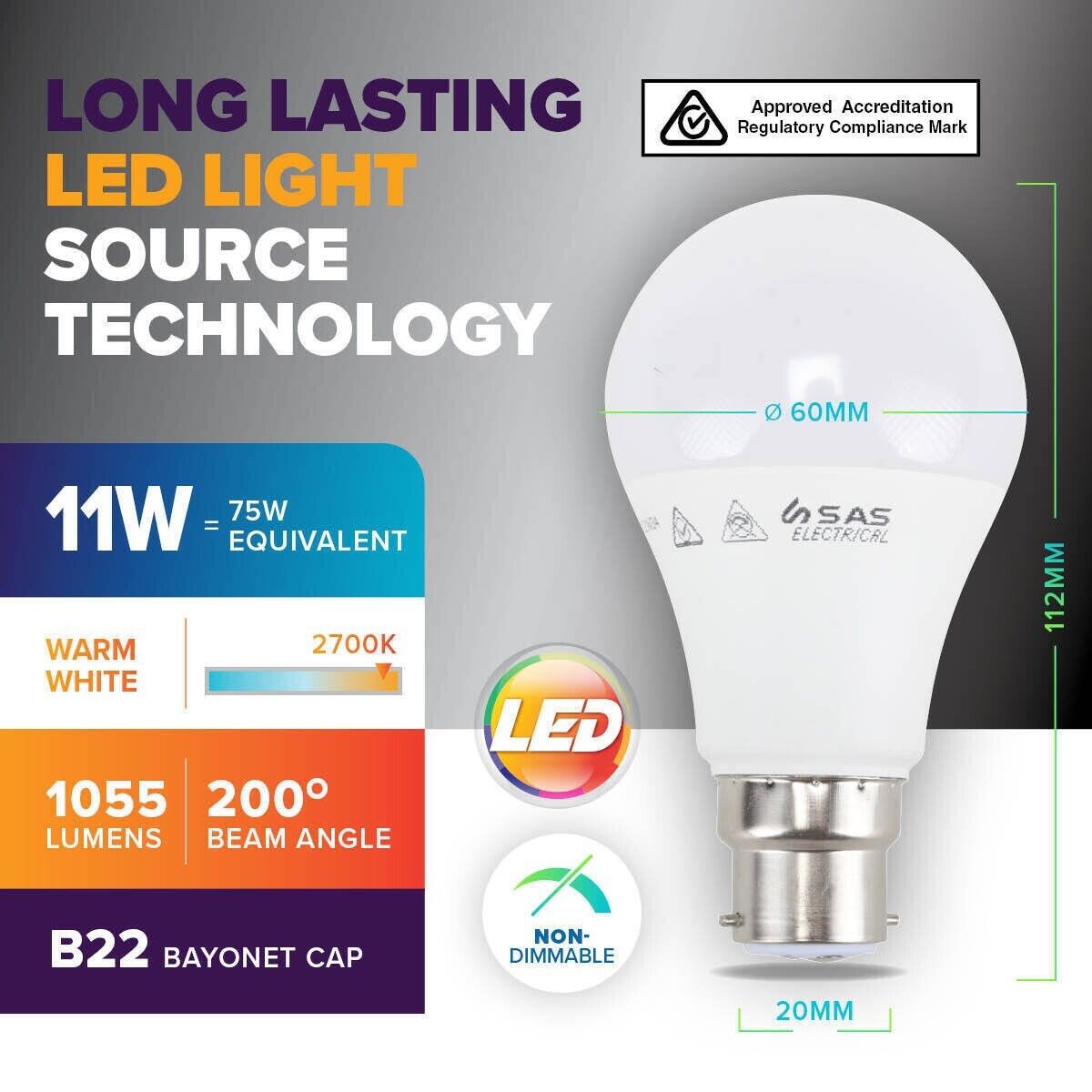 This of 11W Bayonet B22 LED light bulbs emit warm white light.