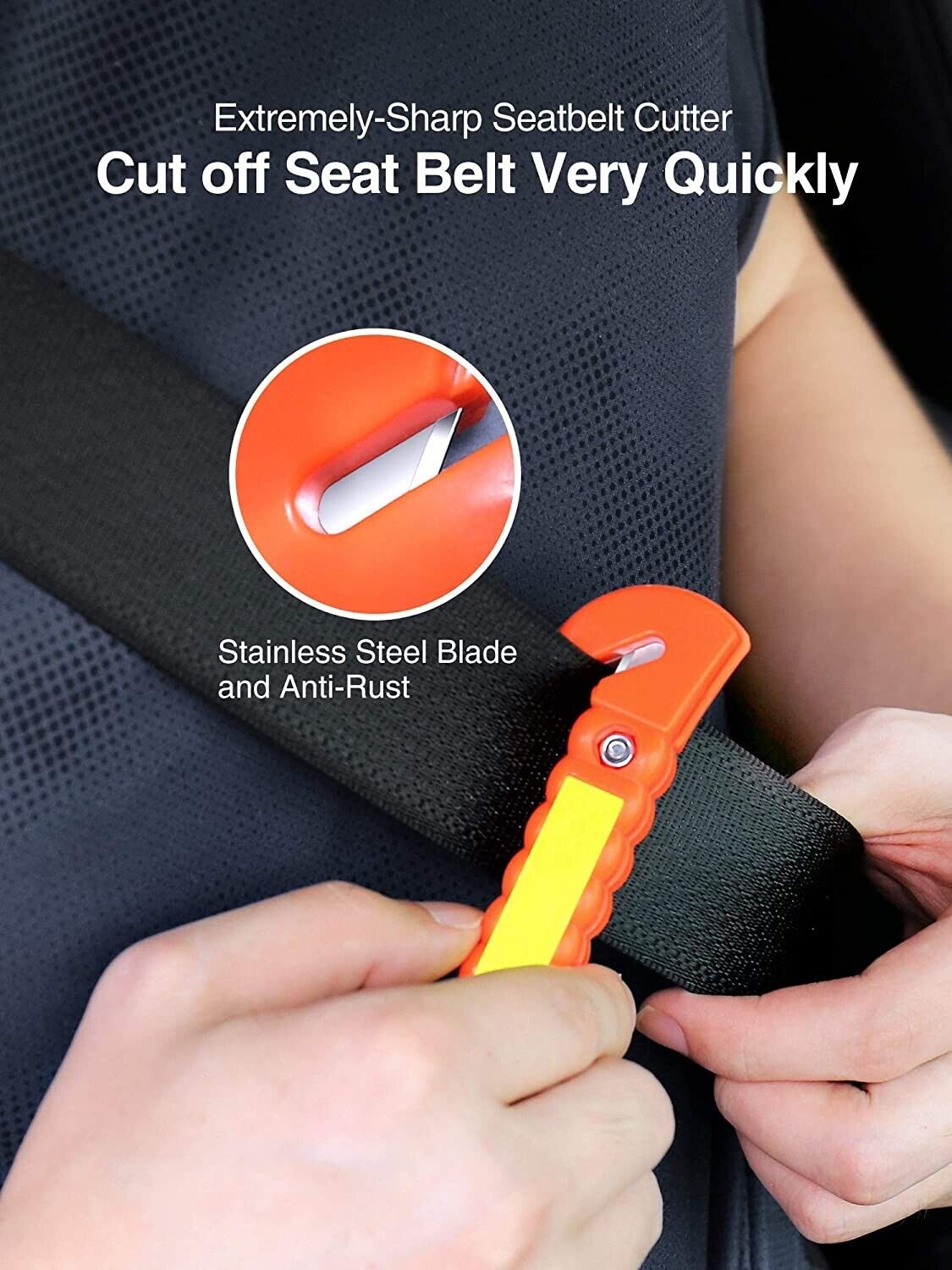 - 2-in-1 COMBINATION: The head of the car safety hammer has a double-sided hammerhead designed to break windows in one go, and a sharp seat belt cutter at the base of the hammer will free you from your seat belt in your time of need.