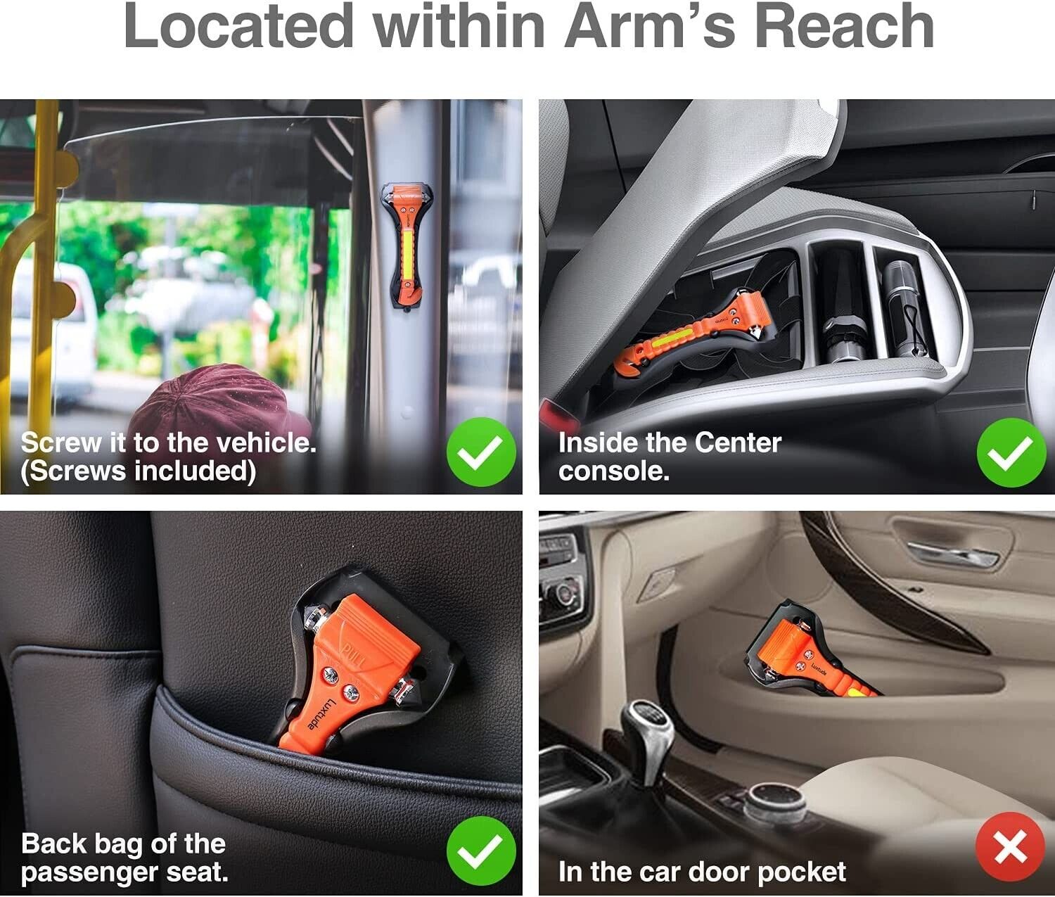 - SUPER PORTABLE & 2 PACK: Measuring in at under 7 inches long and 10 ounces heavy, this tiny safety hammer will protect without stealing space in your car. Mounting bracket and screws come together for easier installing close by and easy access during an emergency. Besides, valued 2-pack provides either a gift or multiple tools to be stashed in both the front and back of your car.