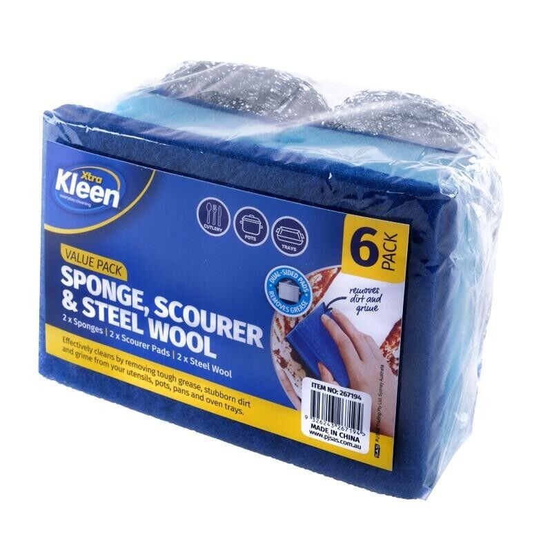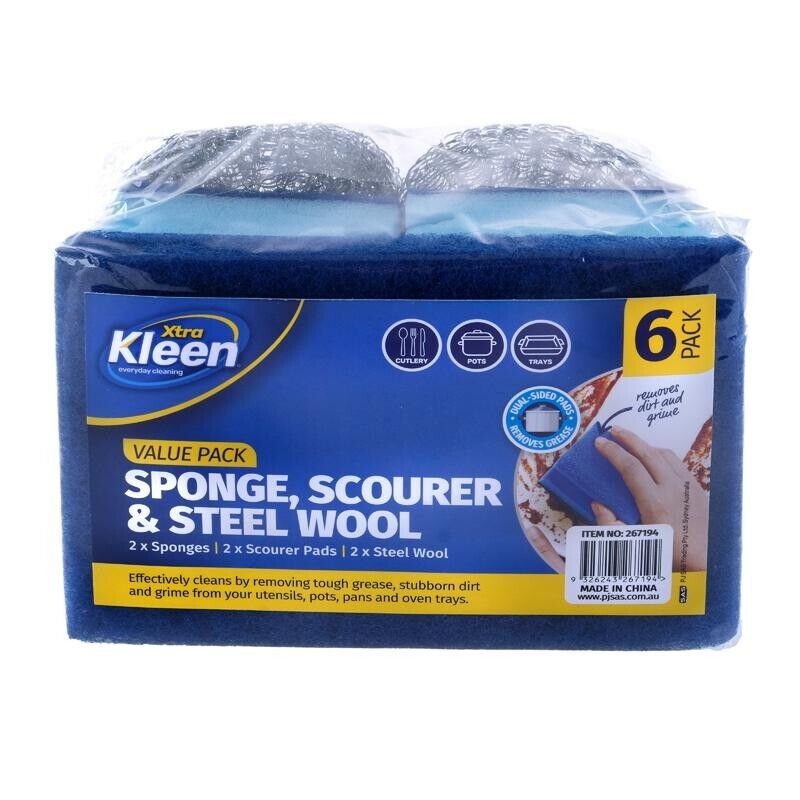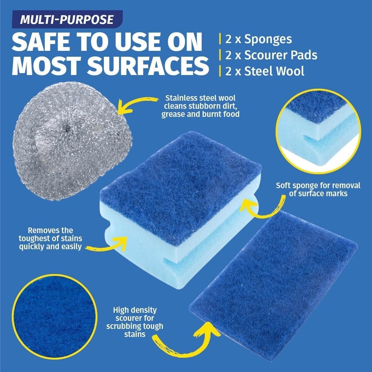 - Value Pack: 2x Sponges, 2x Scourer Pads, 2x Steel Wool