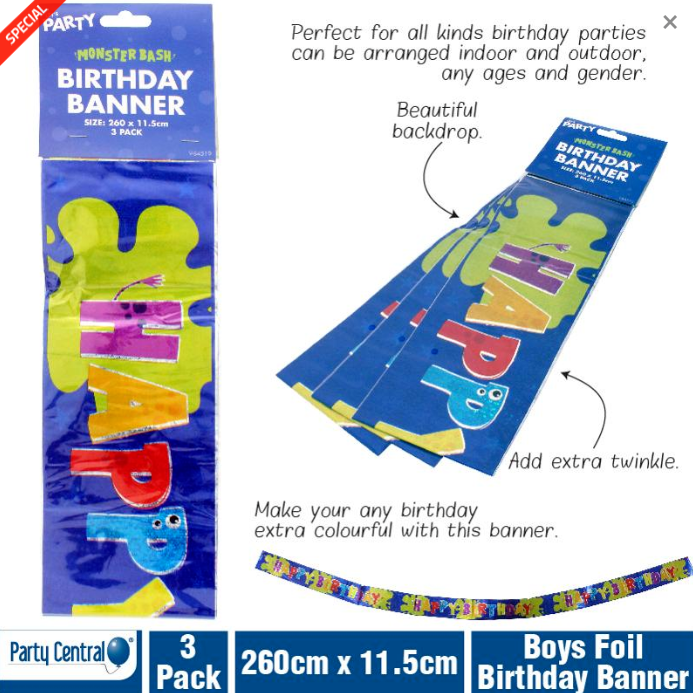 Package Includes: Pack with 3Pk Happy Birthday Foil Banner Kids Party Decorations 260x11.5cm