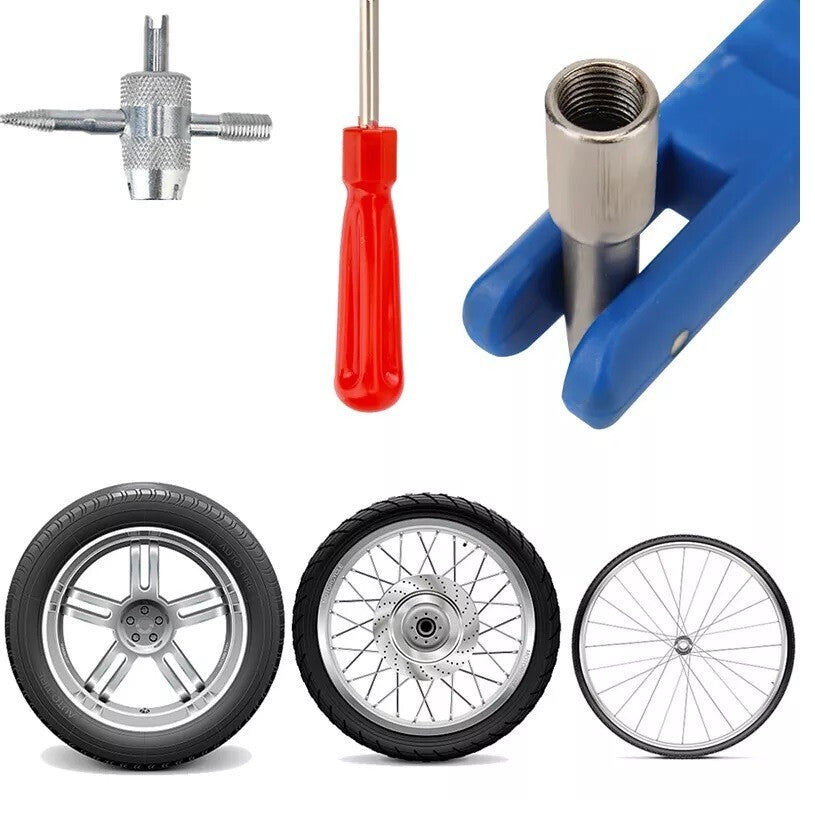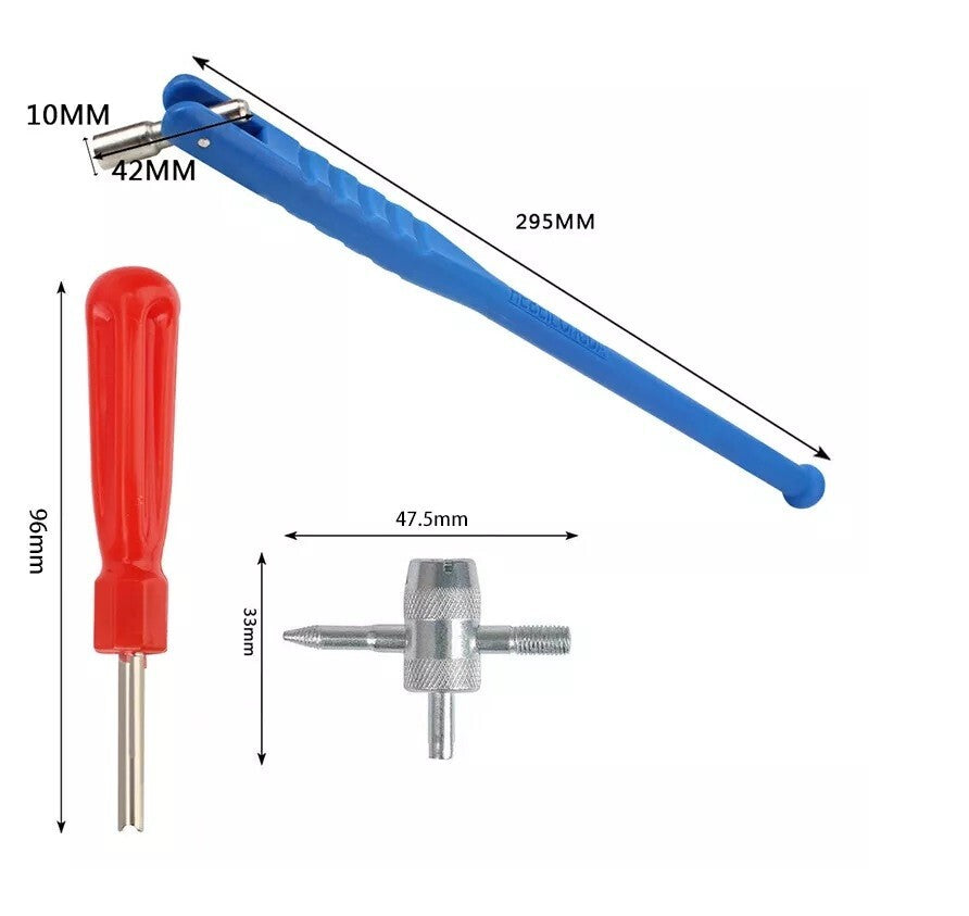 This tire vale repair kit contains tire valve puller, tire valve core remover, tire valve repair tool.