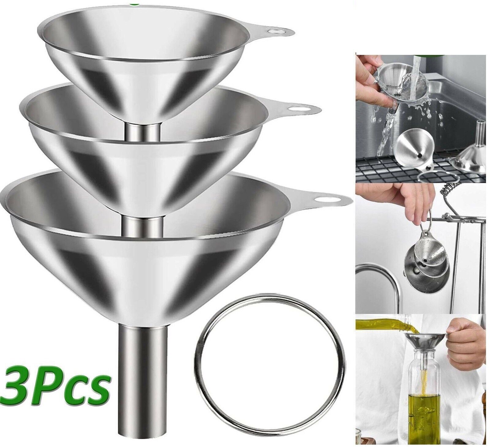 3x Stainless Steel Funnel Oil Liquid Funnel Metal Funnel With Hanging Rings