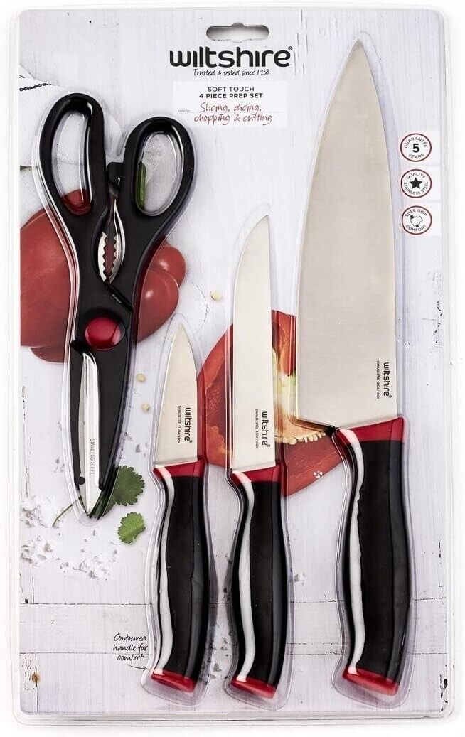Wiltshire Soft Touch Kitchen Knife and Kitchen Scissors are made from high quality stainless steel, the blades are super sharp with taper ground blades. The handles have a soft textured grip for comfort during those meal prep days. Everything you need in your kitchen comes ready in this set. Set includes: cook's knife, utility knife, paring knife and kitchen scissors.