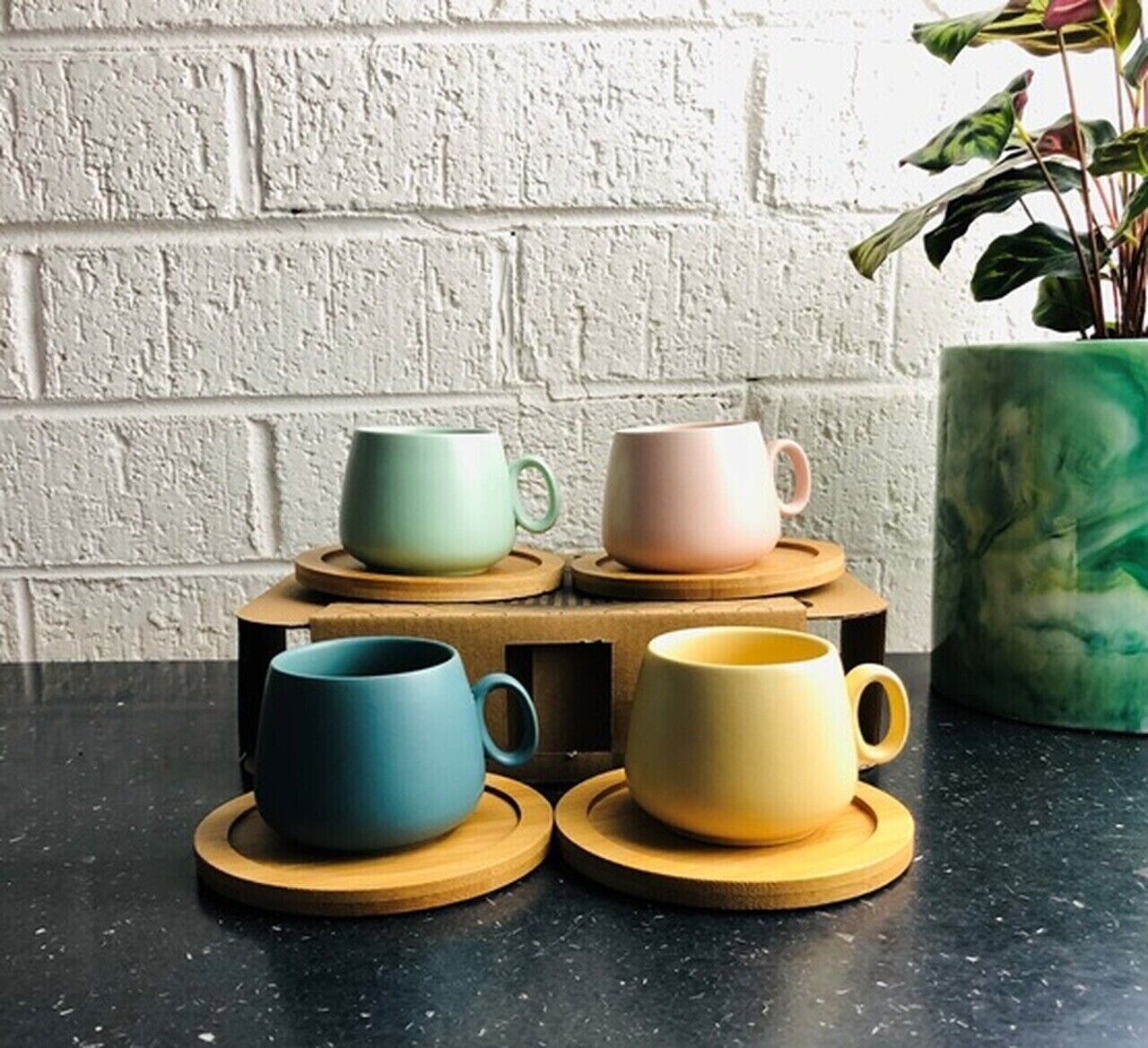 4 pieces Espresso Cups With Bamboo Coasters Lovey Trendy Assorted Colors - 90ml
