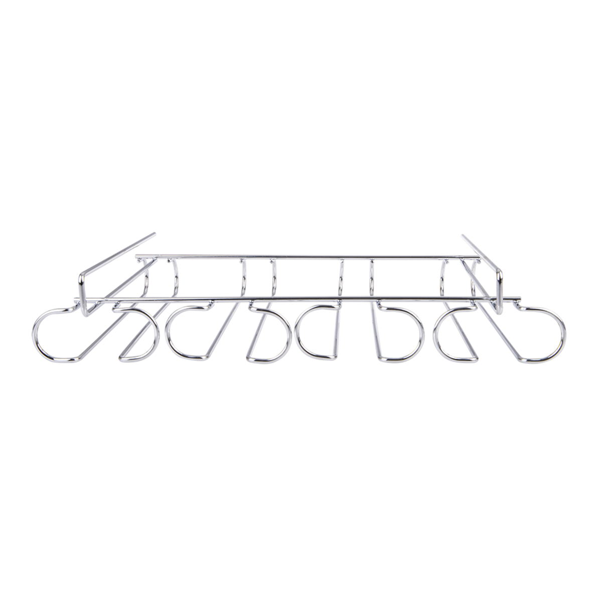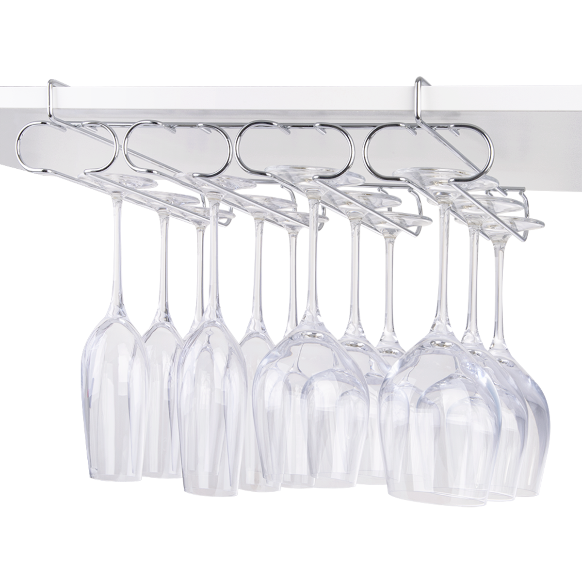 A safe and stylish way to organize and store your stemmed champagne or wine glassware, this practical chrome plated 28cm deep Bartender four rail undershelf stemware rack can be easily suspended under most standard-size cupboard or pantry shelving. No tools or hardware required, ideal for renting or short-term convenience.