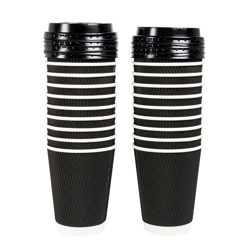 This package contains 20-count disposable coffee cups per pack, a classic black pattern that displays well in any setting.