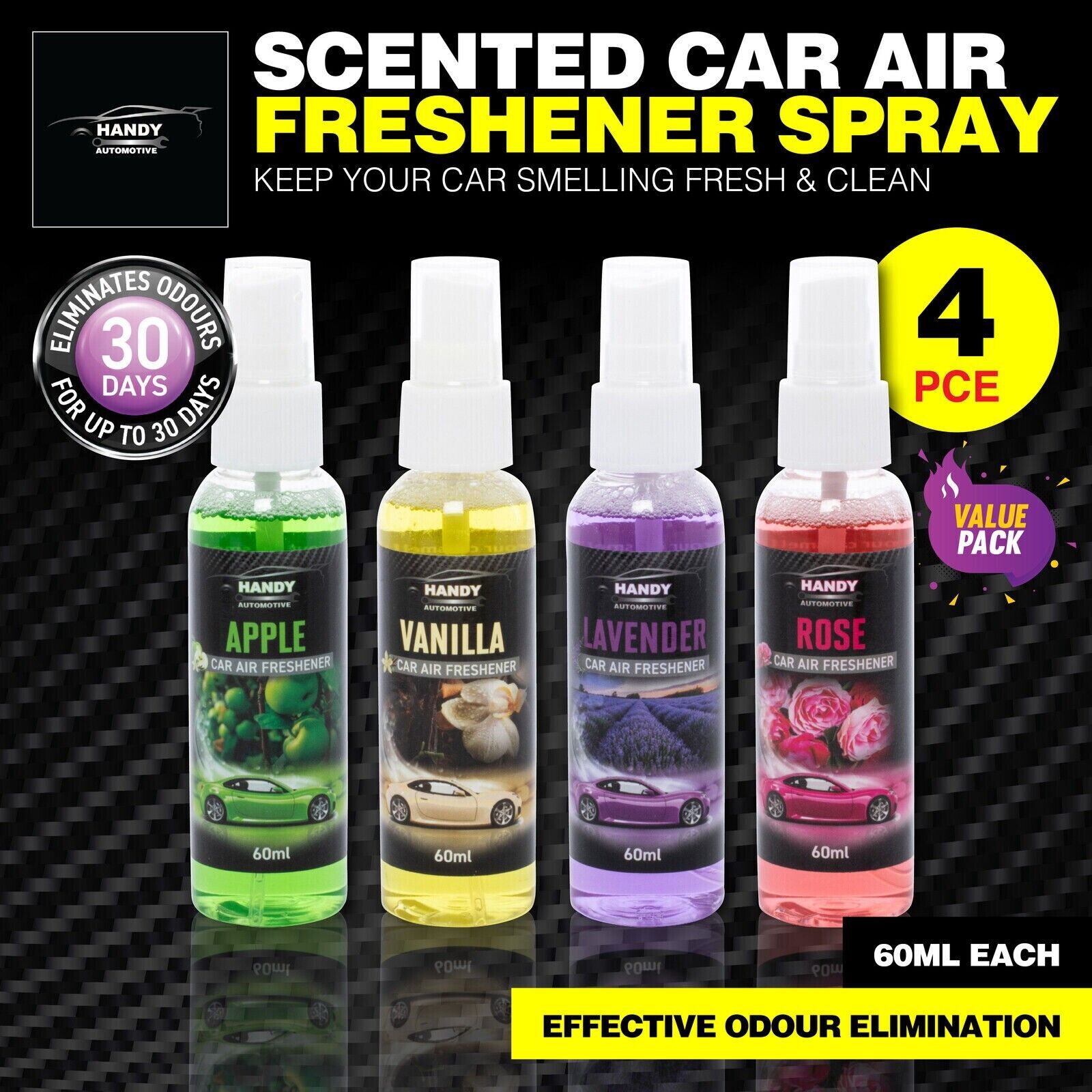 4PCE Car Air Freshener Spray Eliminate Odours Handy Automotive 60ml