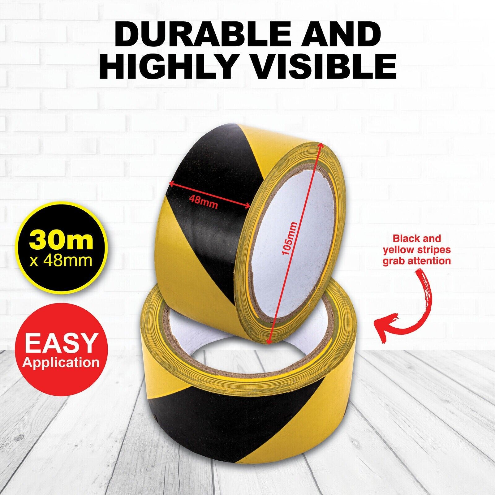 Handy Hardware Strong grip, durable and with high visibility, this Hazard Tape increases safety and awareness. Simple to apply it is perfect to use for line marking, edges of stairs, fencing off areas and bringing attention to high risk, unsafe areas.