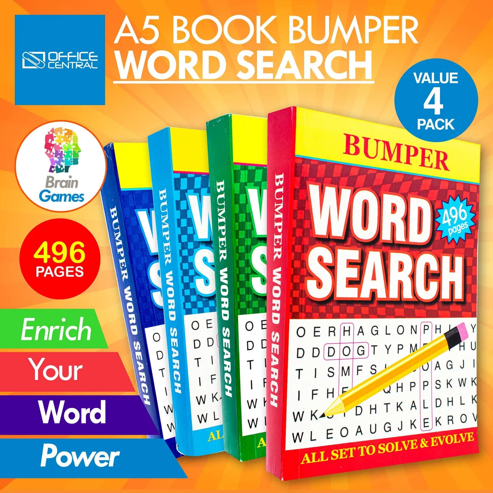 4PK Word Search Activity Books Bumper 496pg A5 Size Adult Brain Games Fun