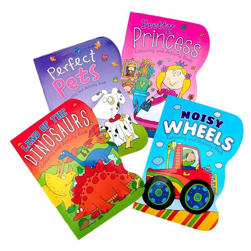 4 Premium Colouring Books 40PG Dinosaurs Princess Wheels Pets