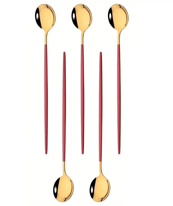 Package Includes: 5 Pcs Long Handled Coffee Spoon - Red & Gold