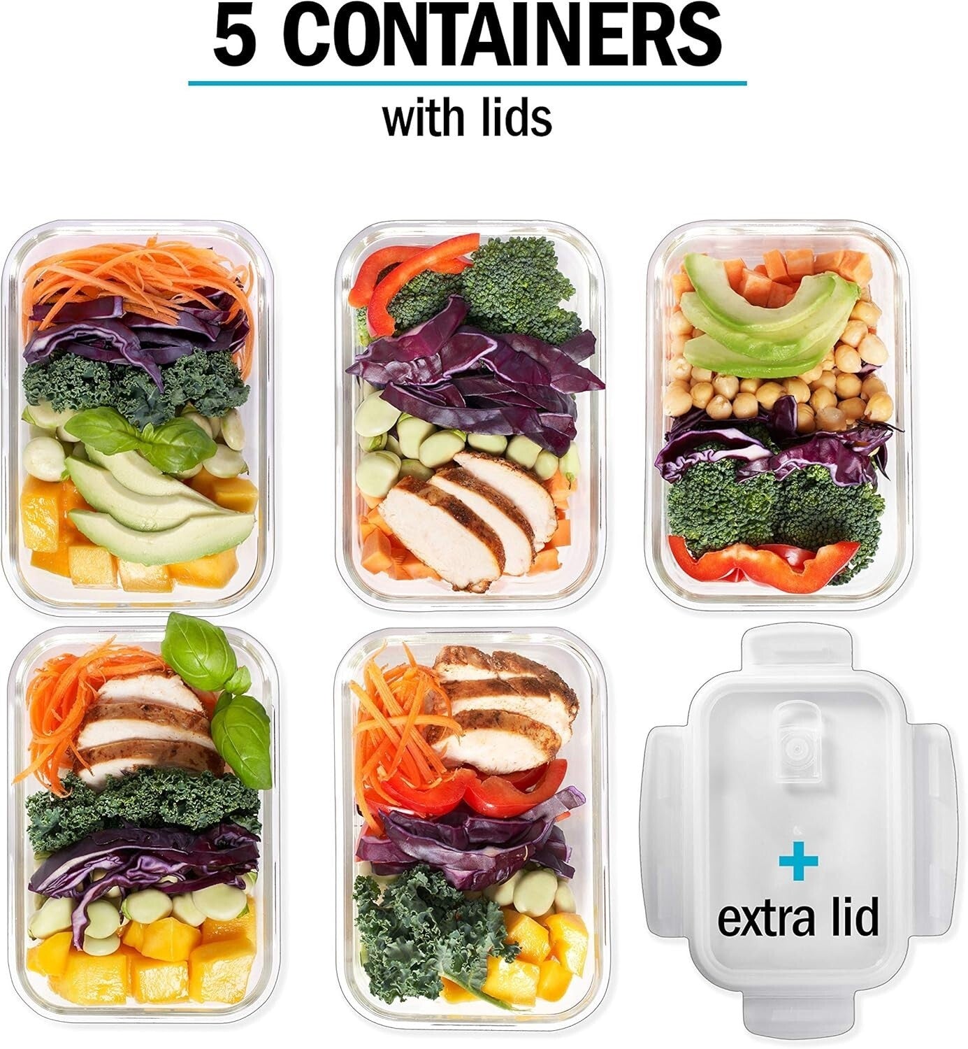 Meal Prep Glass Containers with Transparent, Steam Vent Lids - Airtight Portion Control Food Storage - BPA Free - Microwavable, Dishwasher and Oven Safe [5 Pack + 1 Spare Lid]