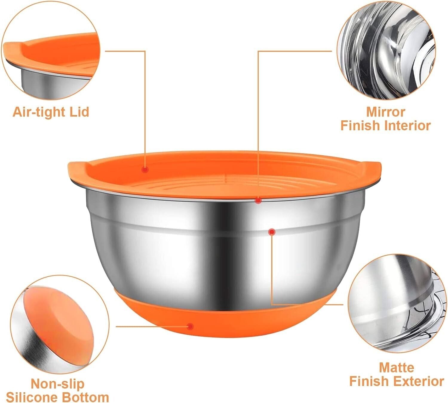 Perfect Design: Our mixing bowls with lids set use deepened design, don't worry about splashing when playing eggs and stirring, the inner curved bottom is smooth, and there is no dead angle when cleaning. Non-slip external silicone bottom, keep the kitchen mixing bowls on the desk steady while mixing.
