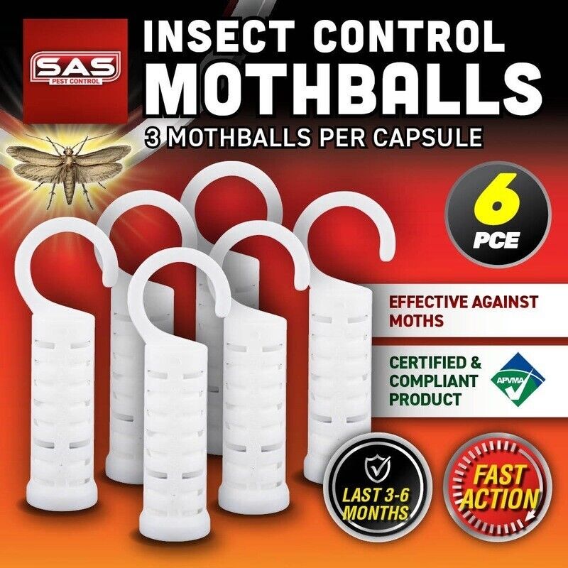 SAS Hanging Container Mothballs Repellant - Lasts Up to 6 months. Protecting Aussie families and homes for the past 25 years, making it the simple, highly effective and traditional way of protecting your clothes and important papers from moths. They come in an easy to hang capsules, allowing you to hang them in your wardrobe to protect your clothes. They can also be placed in drawers, boxes and other storage devices.