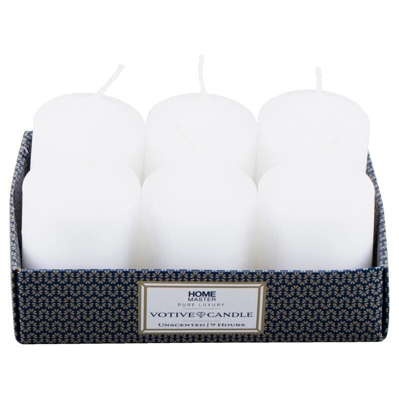 Home Master® These beautiful votive candles create a warm, soft and charming atmosphere. Unscented, with smokeless flames and a burning time of up to 9 hours, these candles are perfect for those special occasions or events.