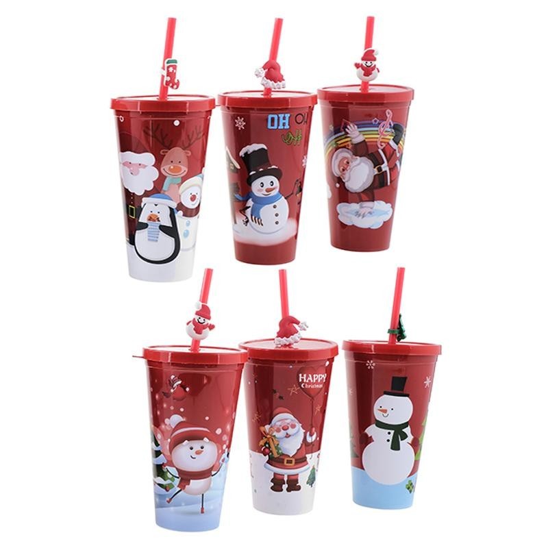 6pcs Christmas Cup with Straw & Lid 550ml Plastic Tumbler Assorted Design Xmas