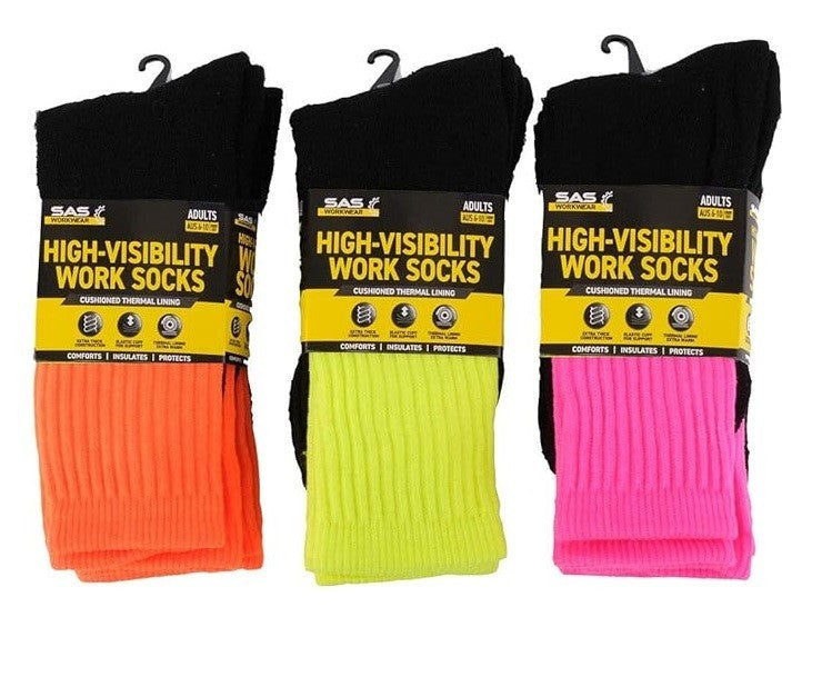 These Hi Visibility Work Socks are comfortable and insulated, boasting a cushioned, thermal lining. These socks are made extra thick and designed to allow moisture to escape easily, which helps prevent chafing and blisters by reducing friction. Their bright, hi visibility Fluro colouring are a great safety feature for when you need to be easily noticed – ideal for work/construction sites, industrial work and roadwork.