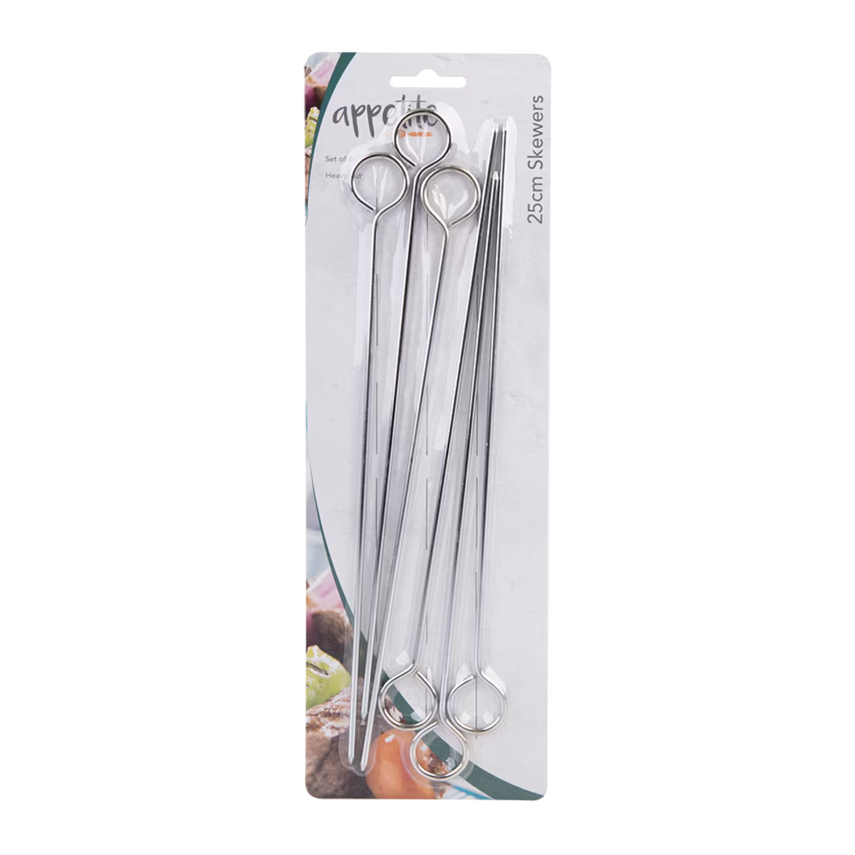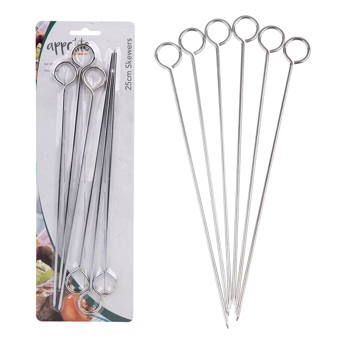 Package Includes: Set of 6 Appetito Chrome Skewers 10"/25cm