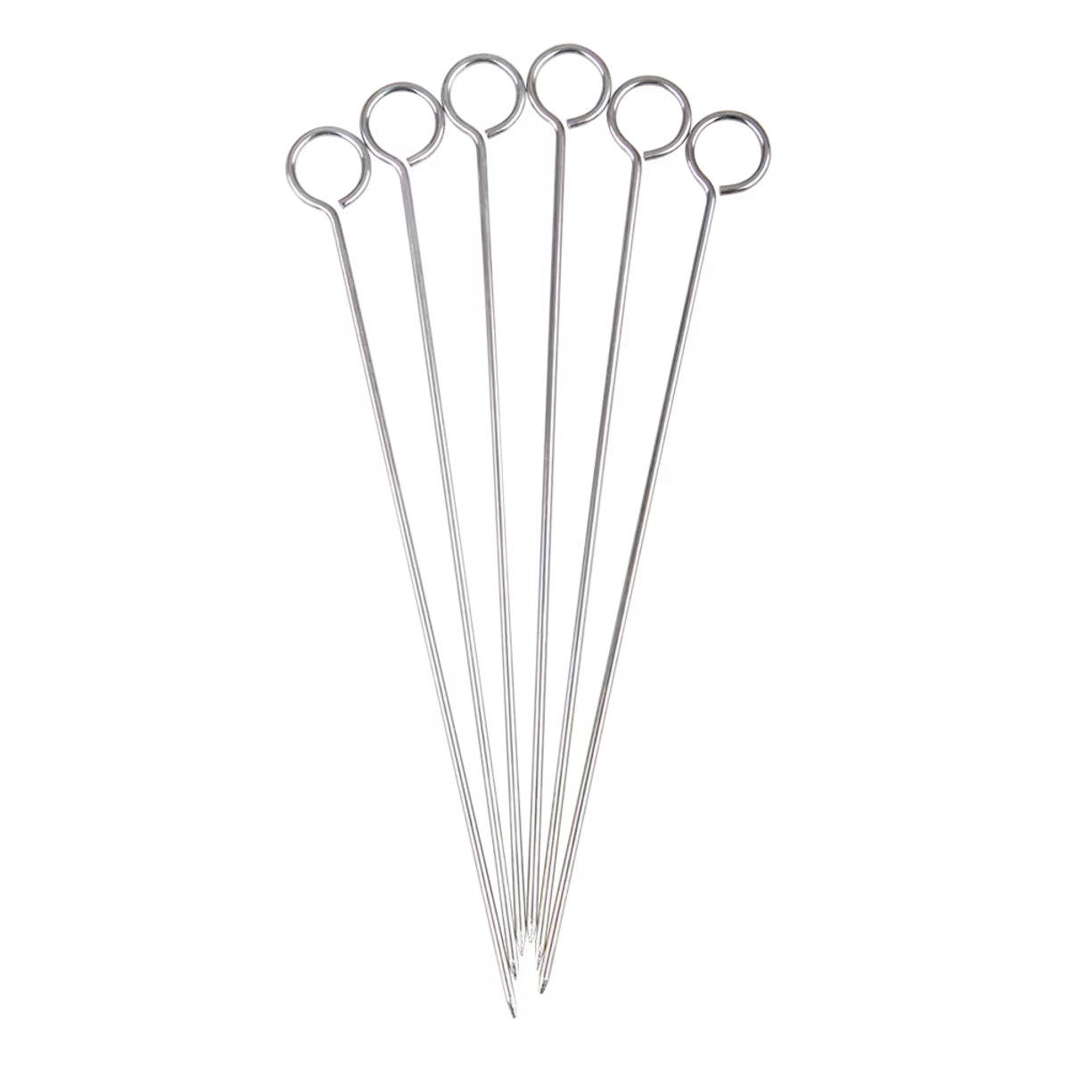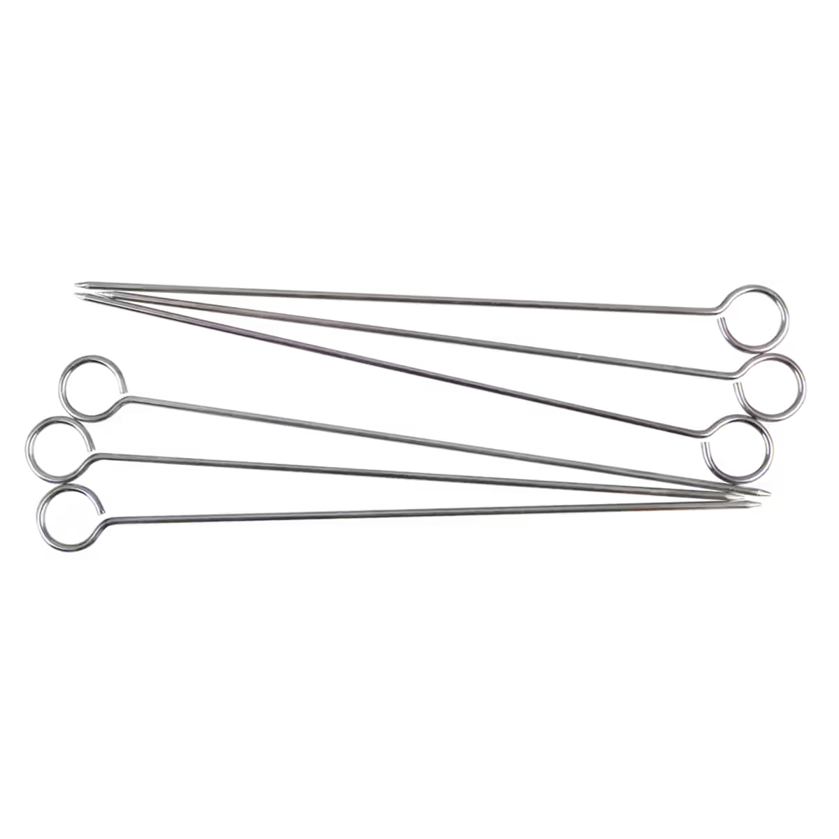 The skewers feature a large turning ring to allow for easy cooking over heat, while being reusable and easy to clean.
