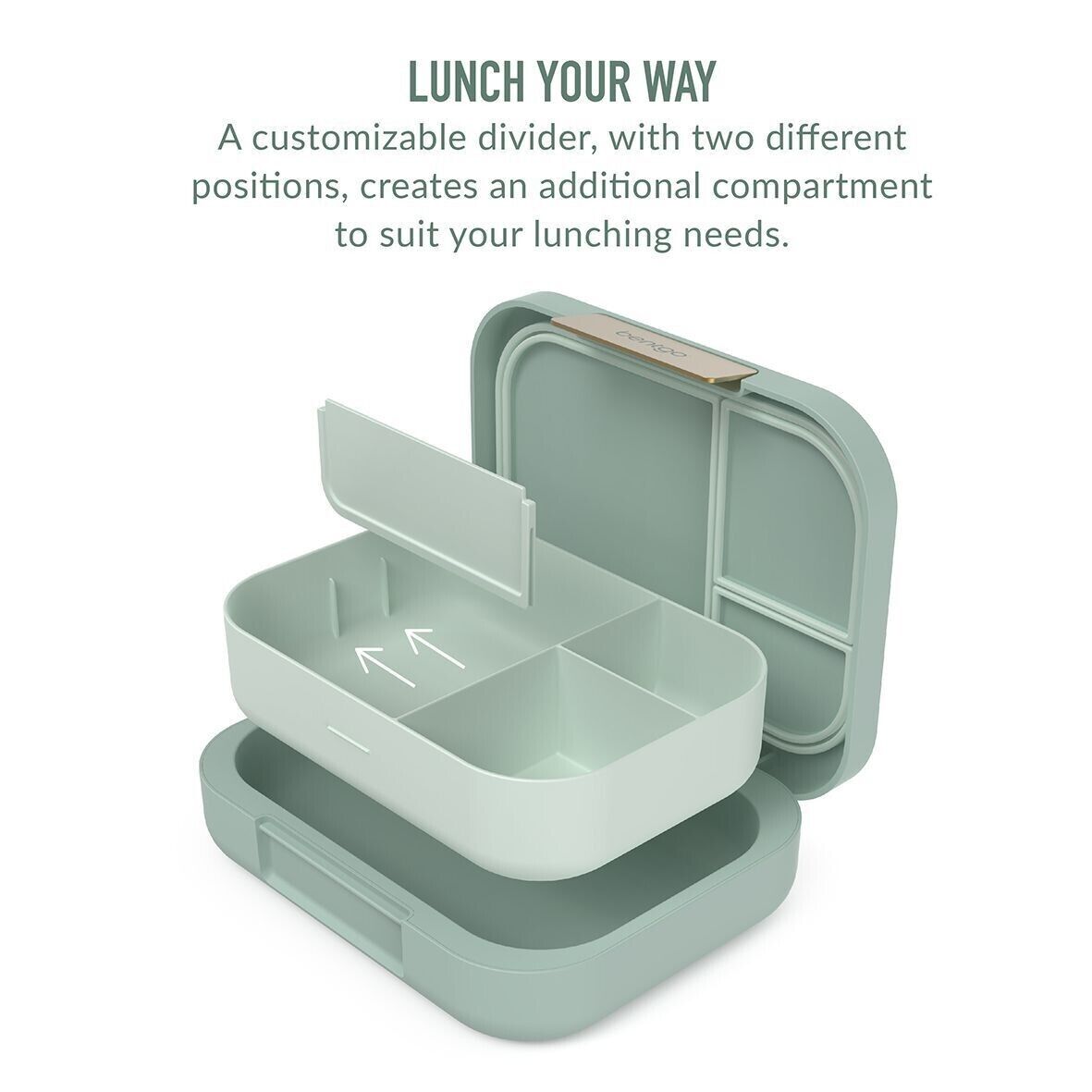 Delight in the bento-style lunch box's versatile design by choosing to use three or four-compartments with a removeable divider, with the box also looking stylish with a contoured outer shell with a sleek matte finish, secured closed with a shiny metallic clip.